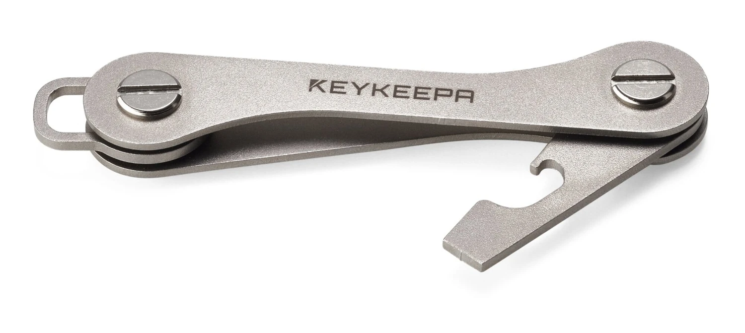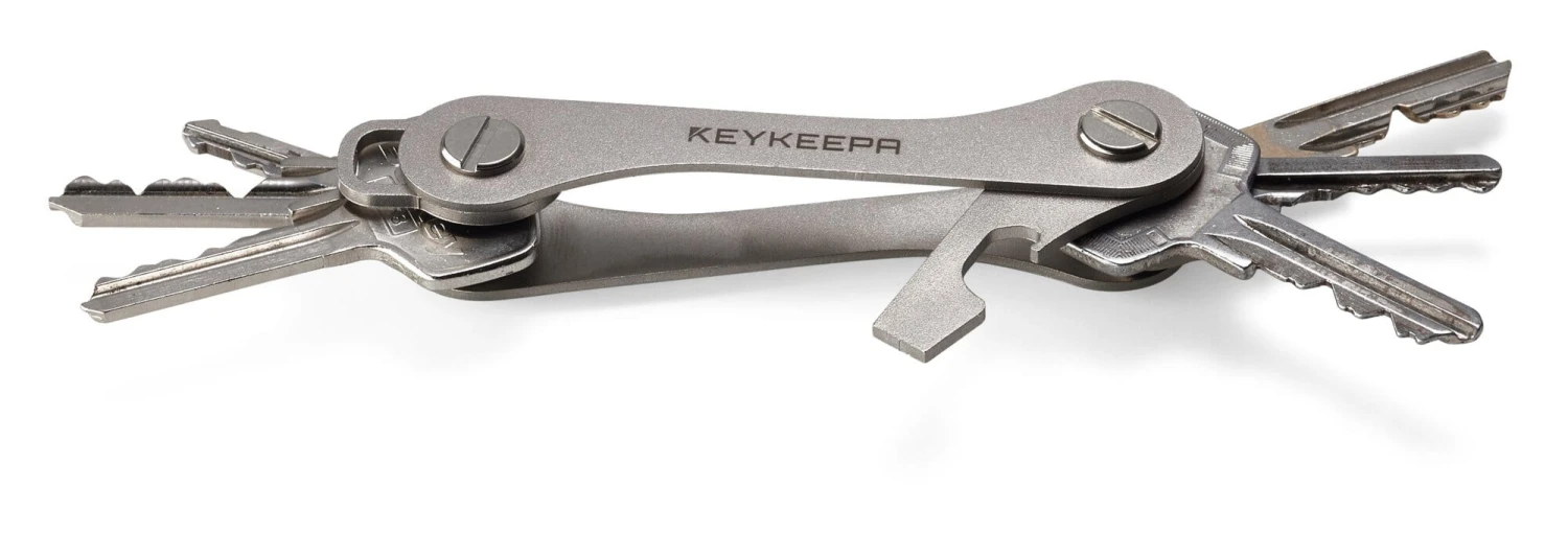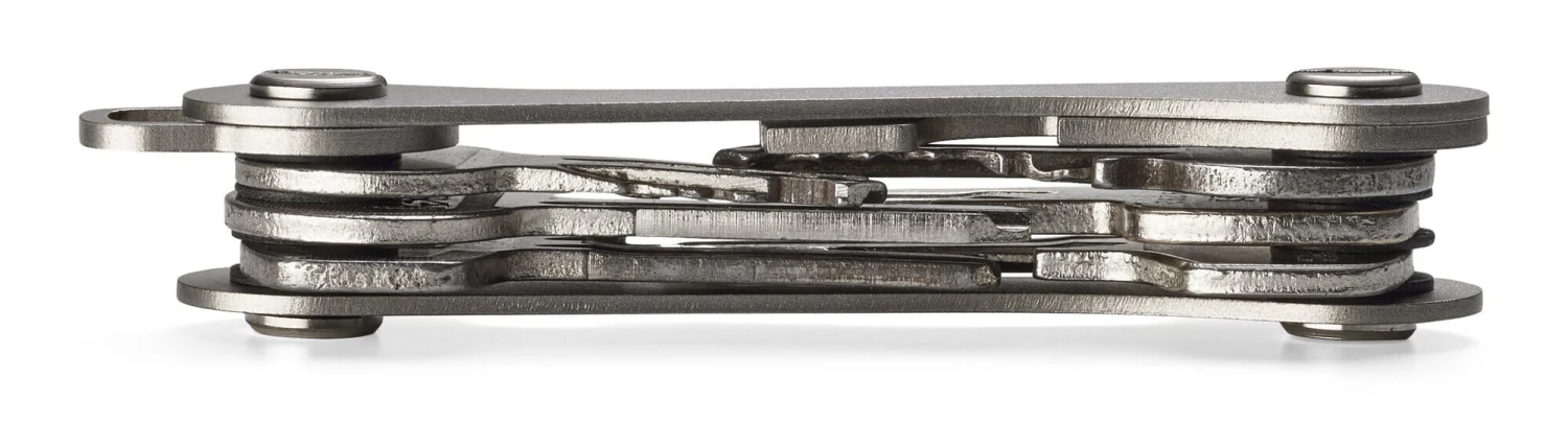 Zwischen zwei Edelstahlbacken fasst der Schlüsselorganisator bis zu 16 Schlüssel zu einem übersichtlichen Ganzen zusammen. Die Schlüssel werden einzeln eingelegt und so fixiert, dass sie sich später wie das Werkzeug eines Taschenmessers aus- und wieder einklappen lassen. Und so wird aus dem Bündel Schlüssel eine Art „Barren“, aus dem mit einem Griff der richtige Schlüssel gewählt werden kann und der zur Ordnung in der Hosentasche beiträgt (und die Taschenbeutel noch vor Beschädigung schützt).