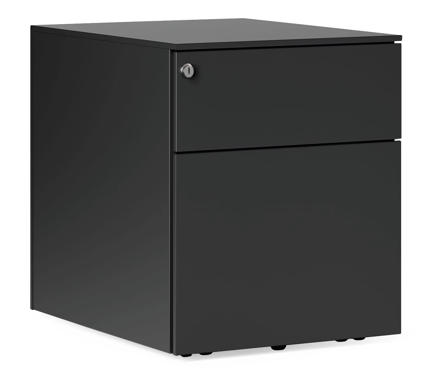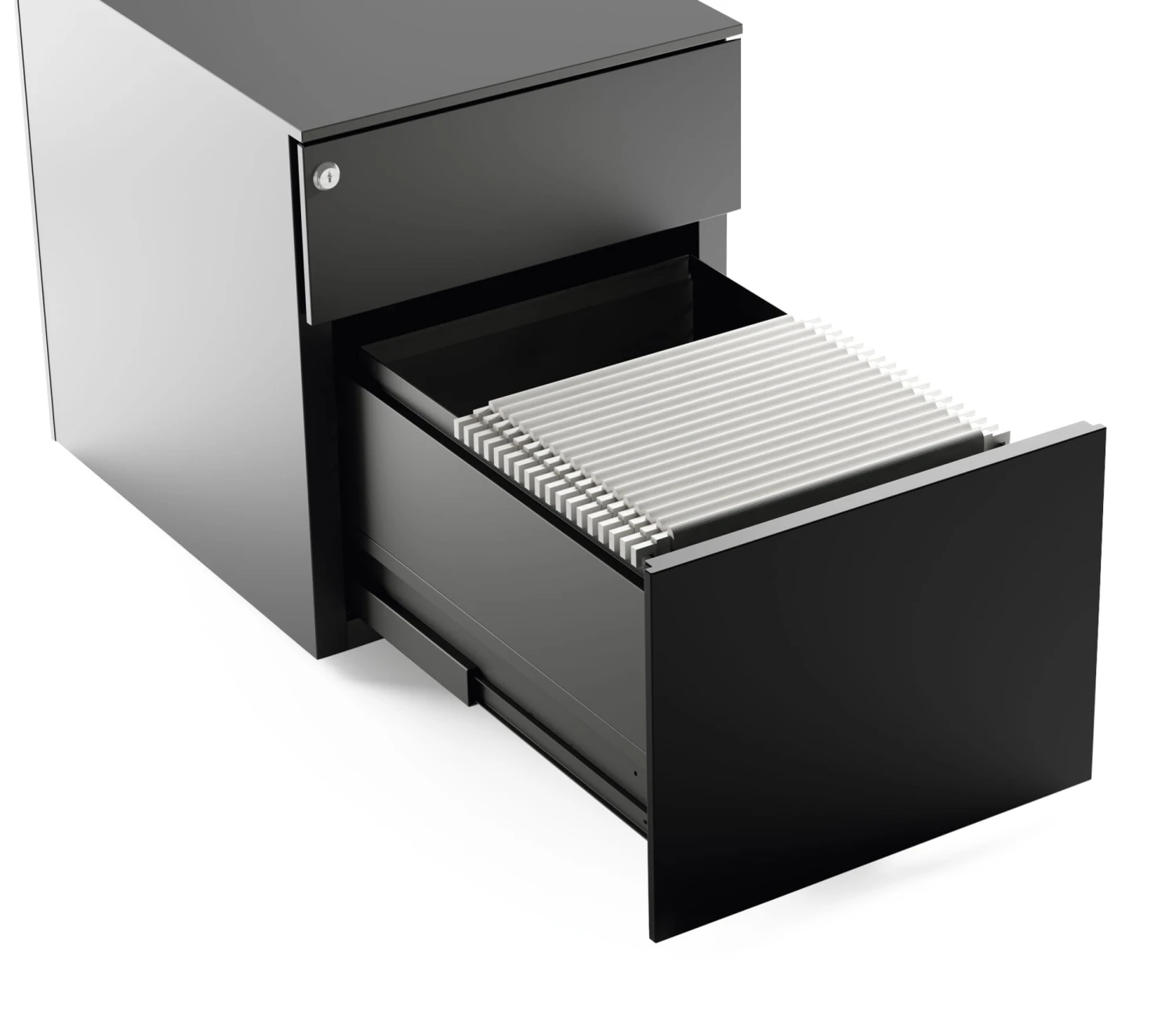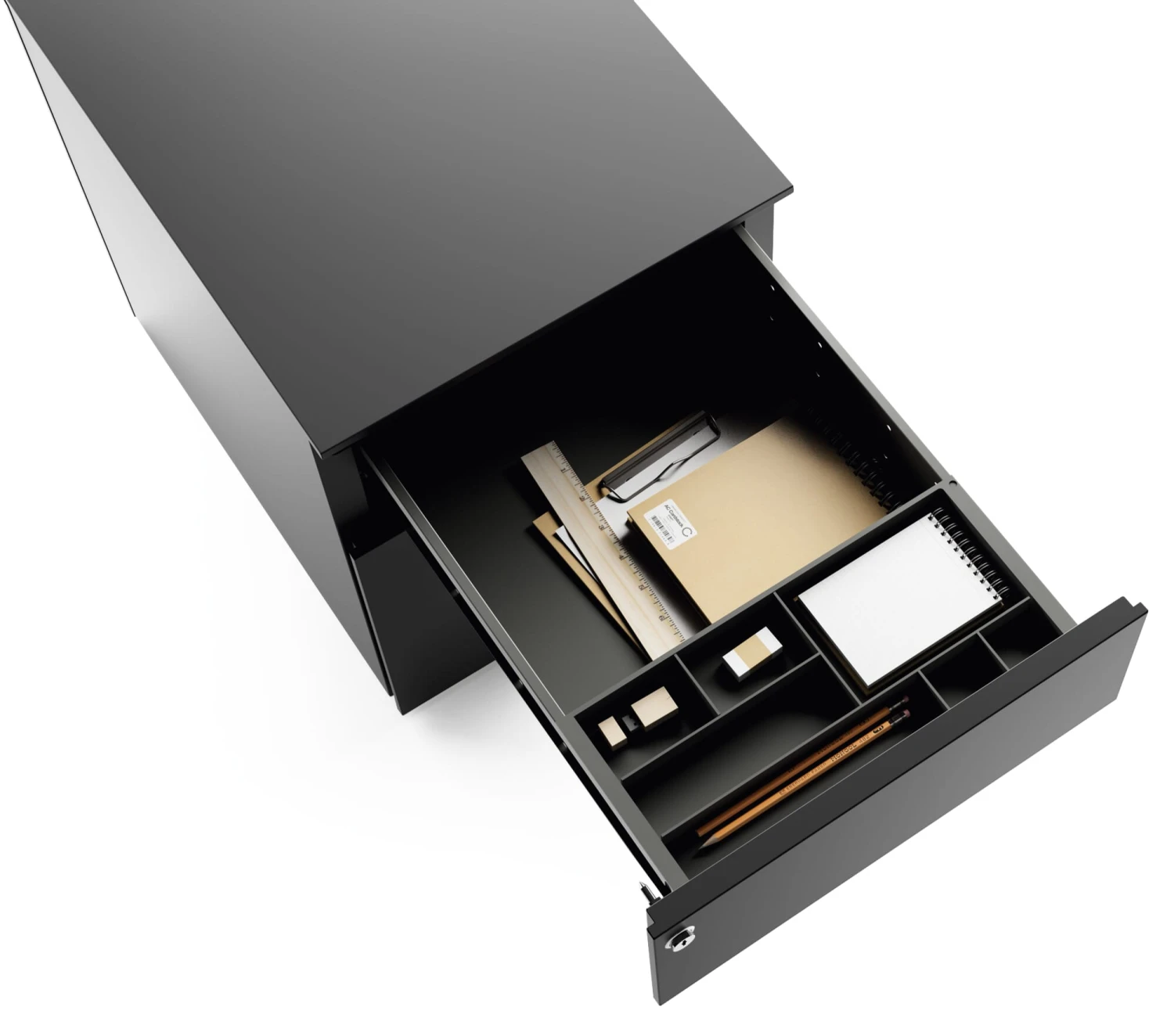 Rollbarer Schreibtischcontainer. KUBO ist aus Stahlblech, wird in Italien gefertigt, ist grundsolide und schön detailliert gearbeitet. Seine Rollen sind unter dem Sockel verborgen montiert. Er besitzt eine große Schublade mit einem Hängeregistereinsatz, sowie eine kleinere, die zusätzlich mit einer Innenschublade für Stifte und Kleinteile ausgestattet ist. Abschließbar mit integriertem Zylinderschloss.