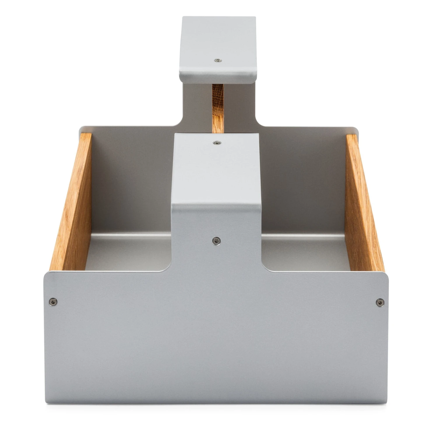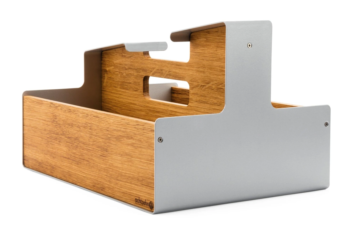 Dieser handwerklich gefertigte Schuhputzkasten aus 10 mm starkem Eichenholz und 1,8 mm starkem Stahlblech ist als offener Quader gestaltet, mit abgerundeten Kanten gearbeitet und stabil verschraubt. Seine beiden Fächer nehmen alles auf, was man zur Pflege seiner Schuhe benötigt. Das durchdachte Design mündet im mittigen Tragegriff, der gleichzeitig als Schuhablage für komfortables Putzen dient, die Grifföffnung hat eine Breite von 11 cm. Mit diesem soliden Gerät – eher möchte man sagen: Kleinmöbel – wird die regelmäßige Schuhpflege zu einem handfesten und sichtbaren Vergnügen. Hergestellt wird der Schuhputzkasten in den Werkstätten für Menschen mit Behinderungen in Bethel.
