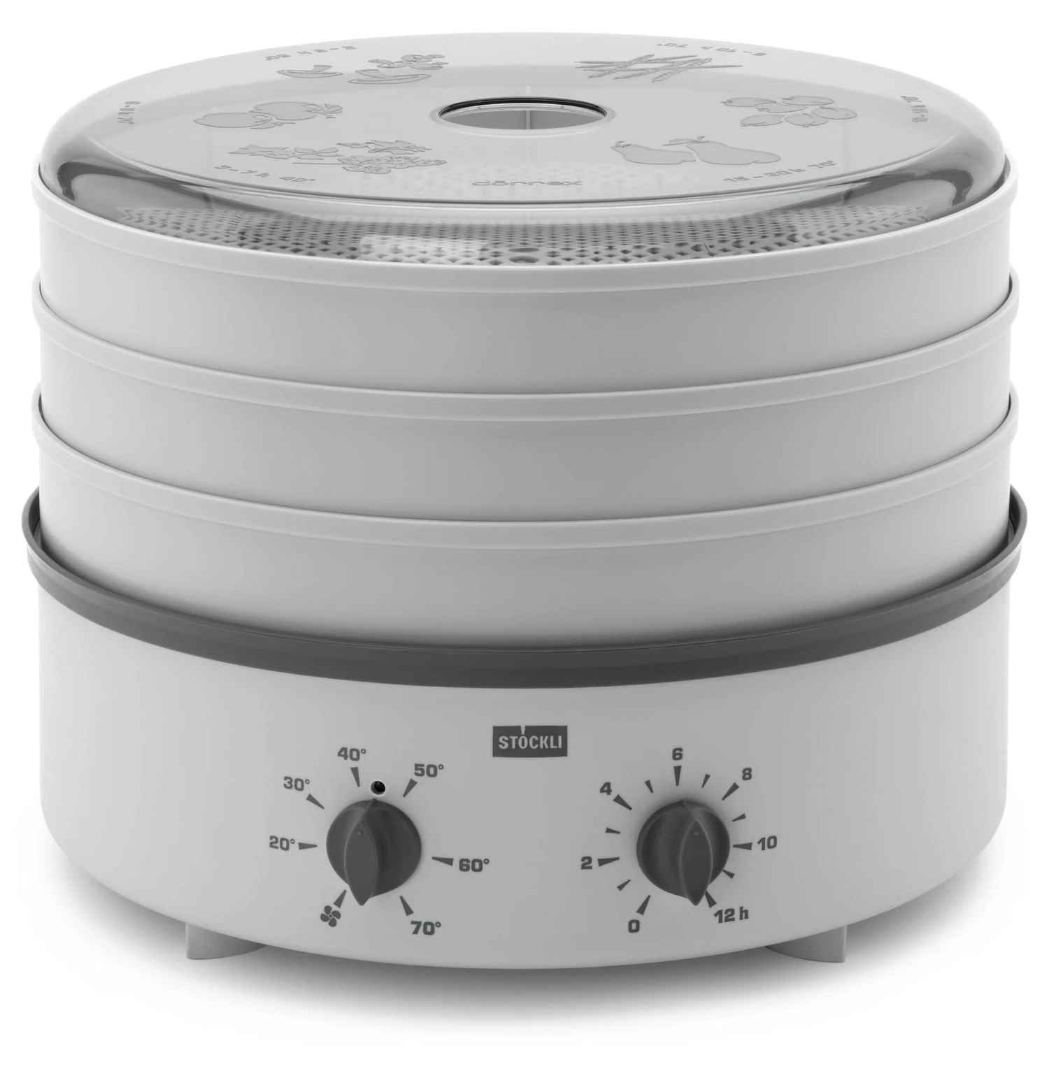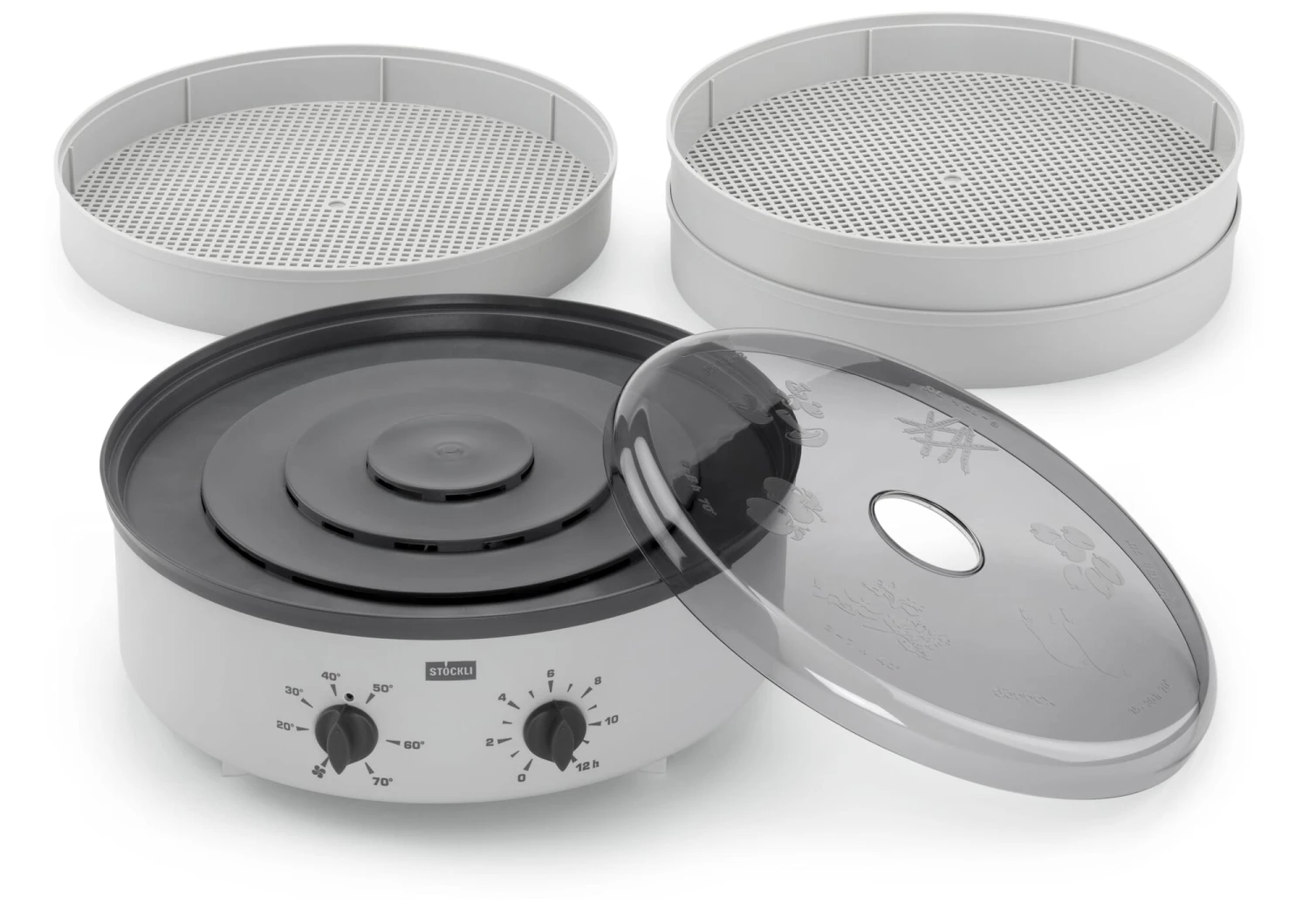 Eine gute Art, die Überfülle der Ernte zu konservieren, besteht darin, Früchten, Gemüsen und Kräutern das Wasser zu entziehen, das für ihr Gedeihen ebenso nötig ist wie für ihr Verderben. Verdunstet es durch Trocknung, dann verlieren die abbauenden Organismen ihre Lebensgrundlage, das Dörrgut wird haltbar – zwar unter Einbuße an Vitaminen, aber verdichtet zu einer machtvollen Ladung an Mineral- und Ballaststoffen. Sie können – wenn der Herbst hinreichend sommerliche Temperaturen beisteuert – im Freien trocknen. Sie können sogar auf der Heizung dörren oder im Backofen, wenn der in der Lage ist, niedrige Temperaturen zwischen 35 und 50 °C zu halten. Am leichtesten geht es aber mit Dörrgeräten, von denen wir Ihnen eines aus Schweizer Produktion anbieten.