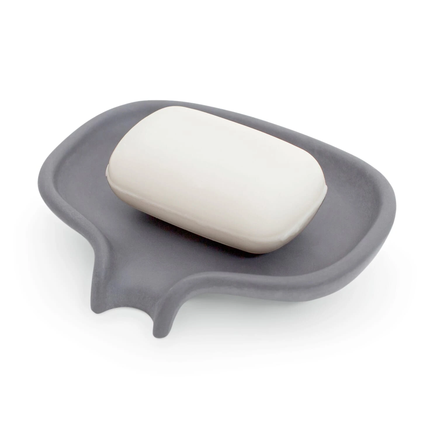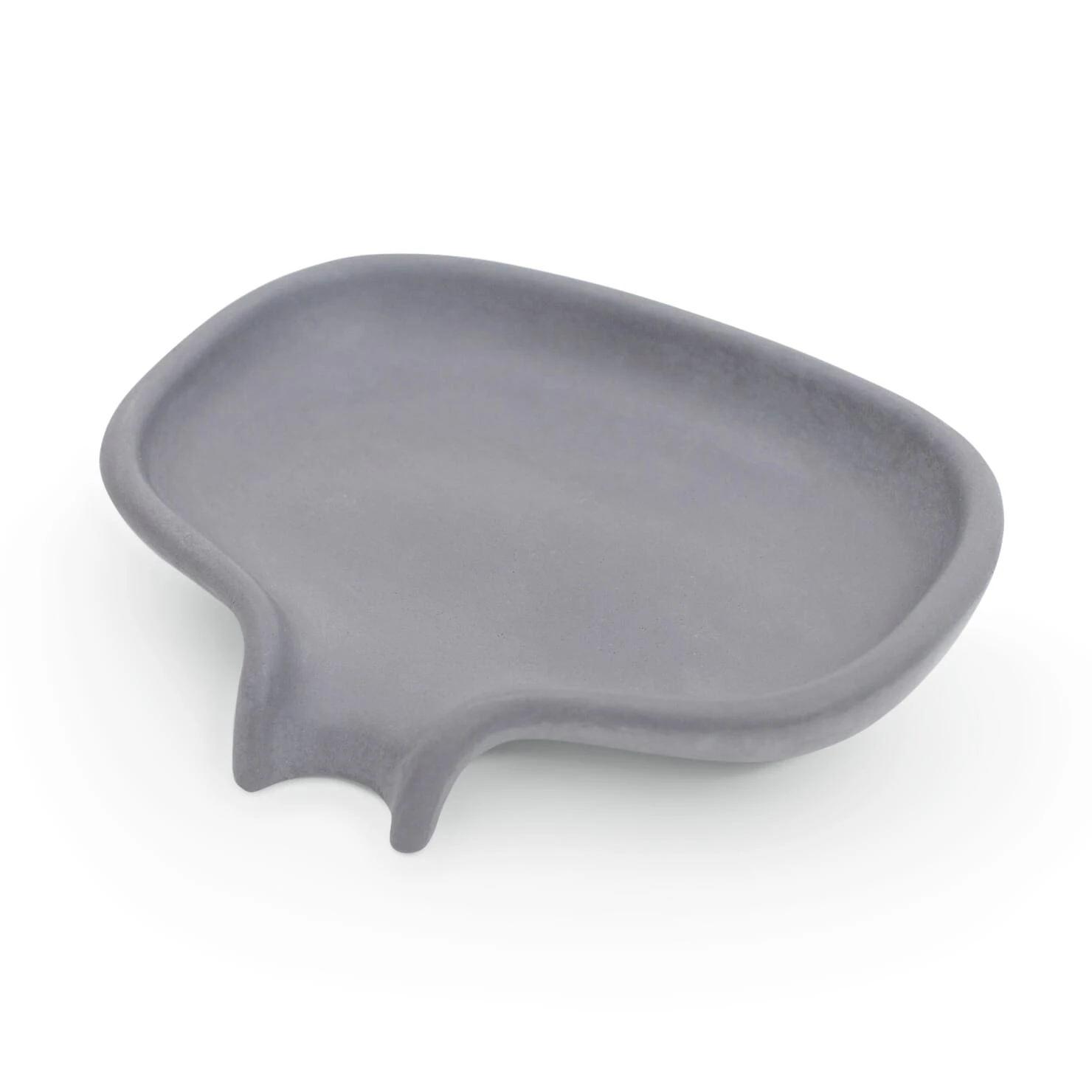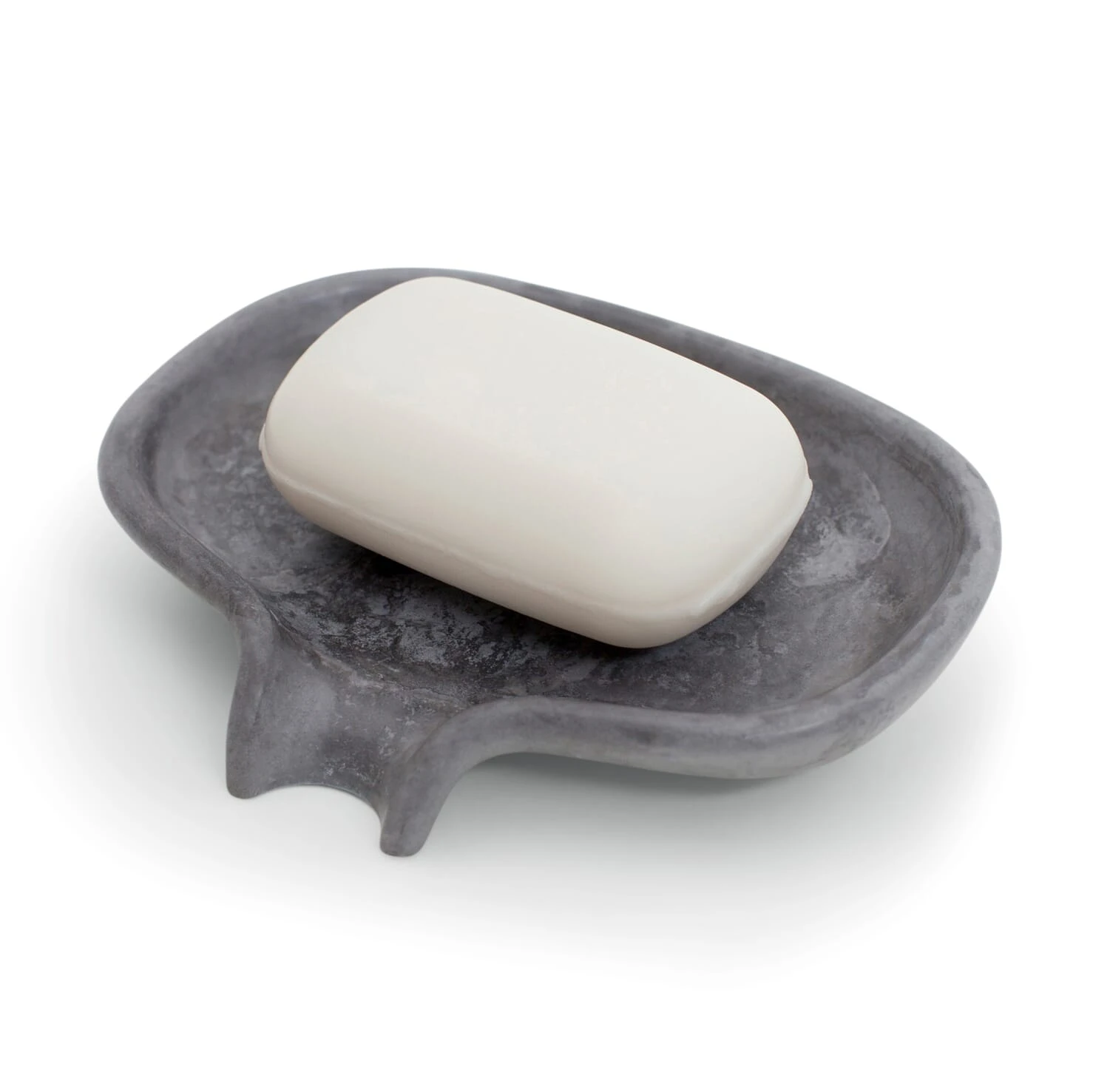 Seifenschale aus Beton, die Wasser nach Nutzung ins Waschbecken abfließen lässt. Hält das Seifenstück trocken und frisch. Handgefertigt in Schweden. Die natürlichen Eigenschaften des Betons werden hervorgehoben, wenn Wasser und Seife mit dem Material reagieren. Füße aus Kork schützen die Oberflächen der Badkeramik und halten die Seifenschale sicher am Platz. Geeignet auch für größere Seifenstücke.