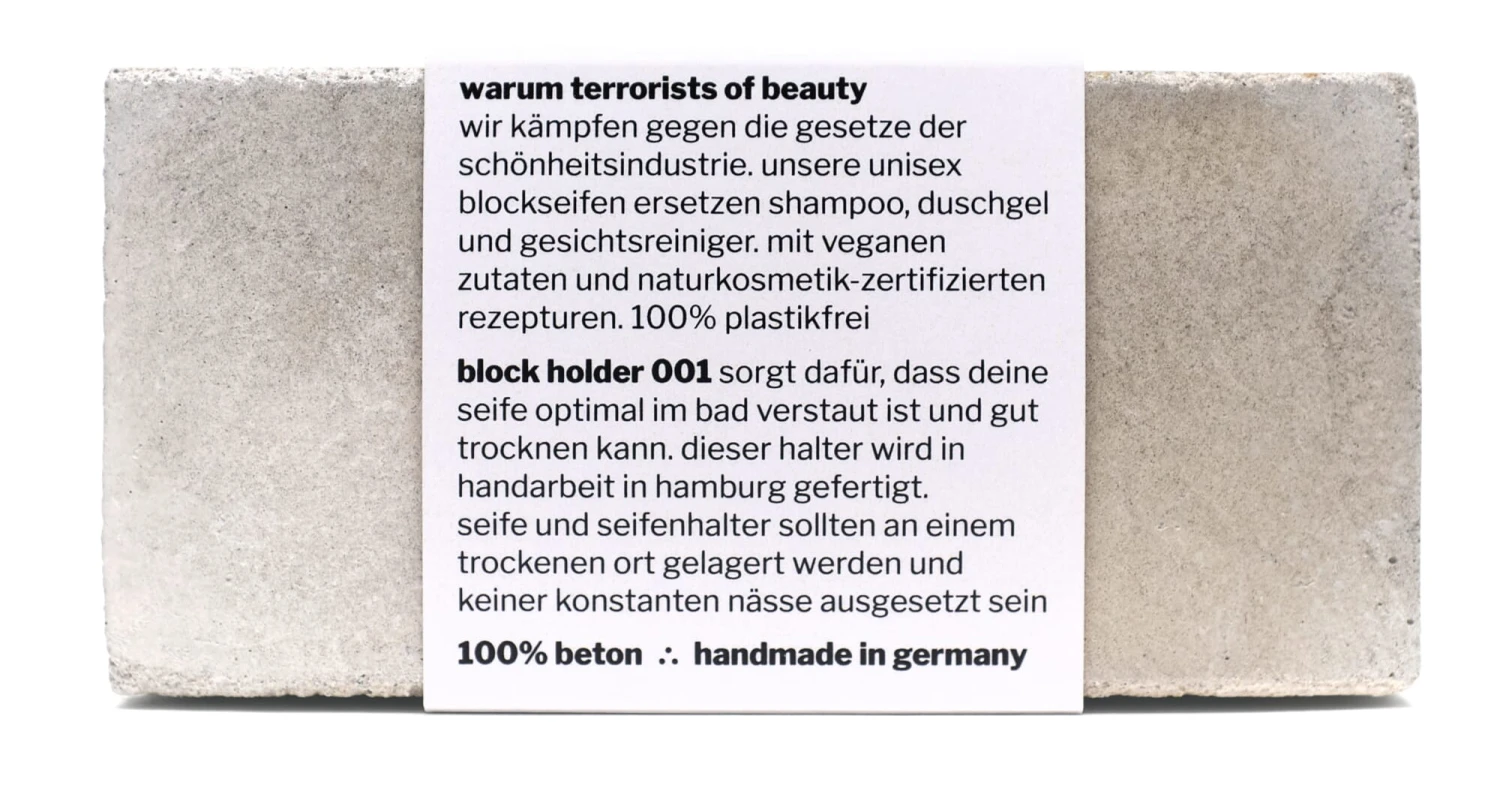 terrorists of beauty wurde 2018 von Mar Navajas Garcia und Natalie Richter in Hamburg gegründet. Die Idee der beiden Frauen: Blockseifen aus hochwertigen Inhaltsstoffen, regional produziert, ohne Tierversuche und weite Wege. Raus mit den Plastikflaschen aus den Badezimmern!