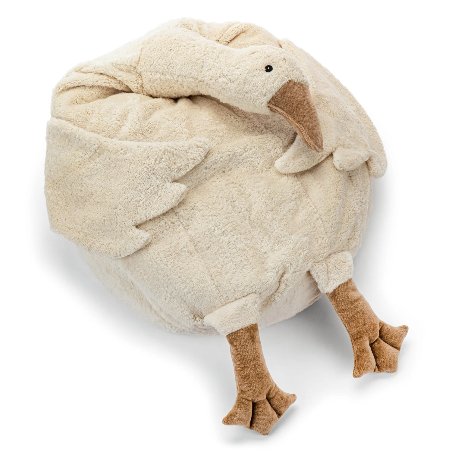 Flexibel und knautschig, dem Kinderkörper wohlwollend nach- und doch Halt gebend: Als gemütliche Ruhezone, kuschelige Leseecke und schmiegsamer Treffpunkt zum Plausch ist ein Sitzsack nahezu unübertroffen. Zudem findet er in jedem Zimmer eine (noch) knautschfreie Zone und lässt sich geschwind dorthin verfrachten, wo er gerade gebraucht und gewünscht wird. Dieser Sitzsack der Manufaktur Senger toppt die Bequemlichkeit durch seine urige Federvieh-Gestaltung: Die beweglichen Flügel und Beine sowie der lange Gänsehals lassen sich beliebig drapieren und können dadurch kleine und größere Kinder so kuschelig wie eine Decke (oder eine liebevolle Umarmung) umschmiegen.