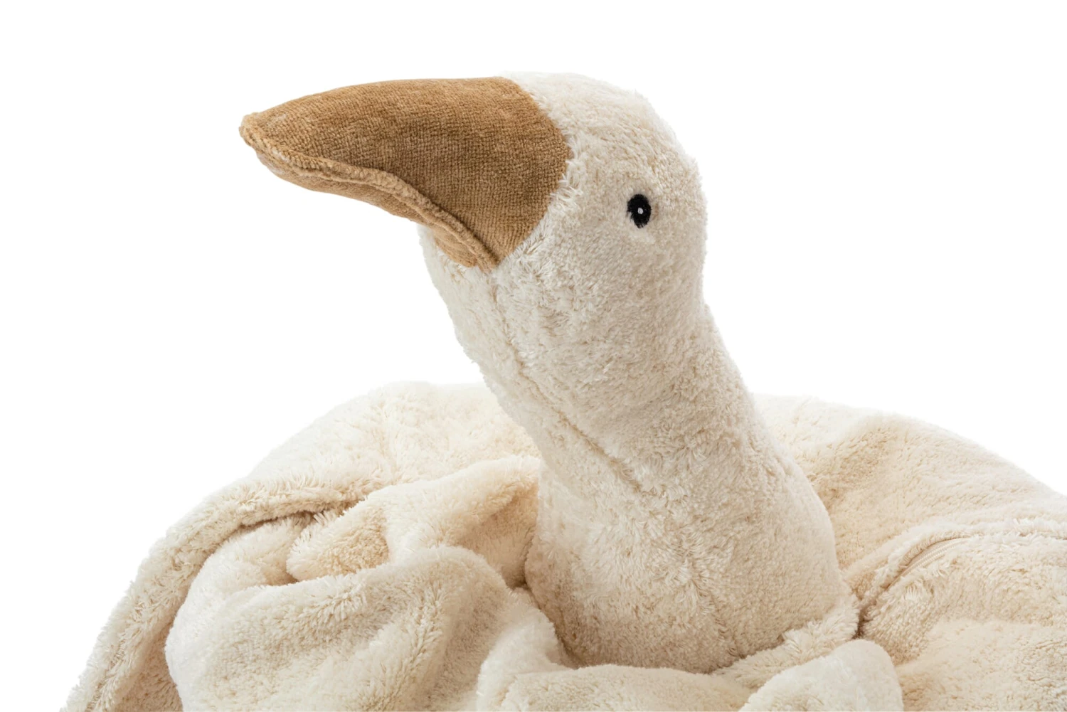 Natürliche Materialien und eine sorgfältige Fertigung von Hand sorgen dafür, dass der Wohlfühl- und Kuschelfaktor von langer Dauer ist. Der äußere Bezug besteht ebenso wie das Inlett aus reiner Bio-Baumwolle, die Füllung von Kopf, Hals und Füßen aus reiner Schurwolle deutscher Herkunft. Das Inlett des (Sitz-)Rumpfes ist mit Dinkelspelzen (kbA) gefüllt und nimmt sich damit eindeutig angenehmer und umweltfreundlicher aus als handelsübliche, beharrlich quietschende Styroporfüllungen. Am Übergang zum Rumpf sind Hals, Flügel und Beine lockerer gestopft, sodass sie in jede gewünschte Position gebracht werden können. Und da zum guten (Bilder-)Buch oftmals ein knuspriger Keks, zum Malbuch das Zeichnen über die Linie und zum schlummernden Kind der Spuckefaden gehört, kann das Inlett herausgenommen und die Gans einer Handwäsche unterzogen werden. So bewährt sich der Senger Sitzsack als knautschig-kuscheliger Begleiter – lange über das Kleinkindalter hinaus.