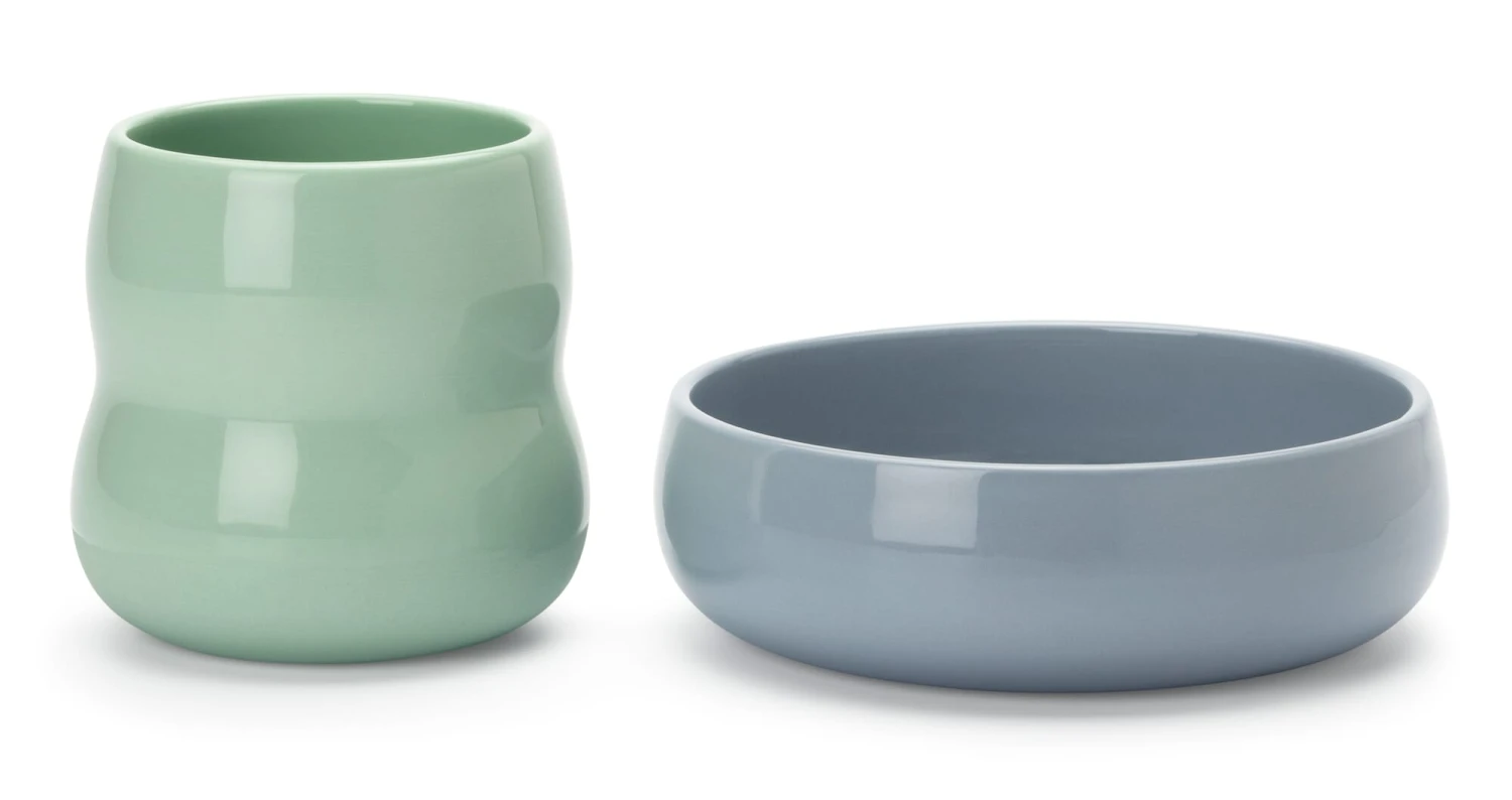 Ein leicht taillierter Becher, eine Schale mit hochgewölbtem Boden und leicht nach innen geneigtem Rand: Die Gestaltung dieses Kindergeschirrs aus Porzellan ist nicht nur in ästhetischer, sondern vor allem in funktionaler Hinsicht intelligent durchdacht.