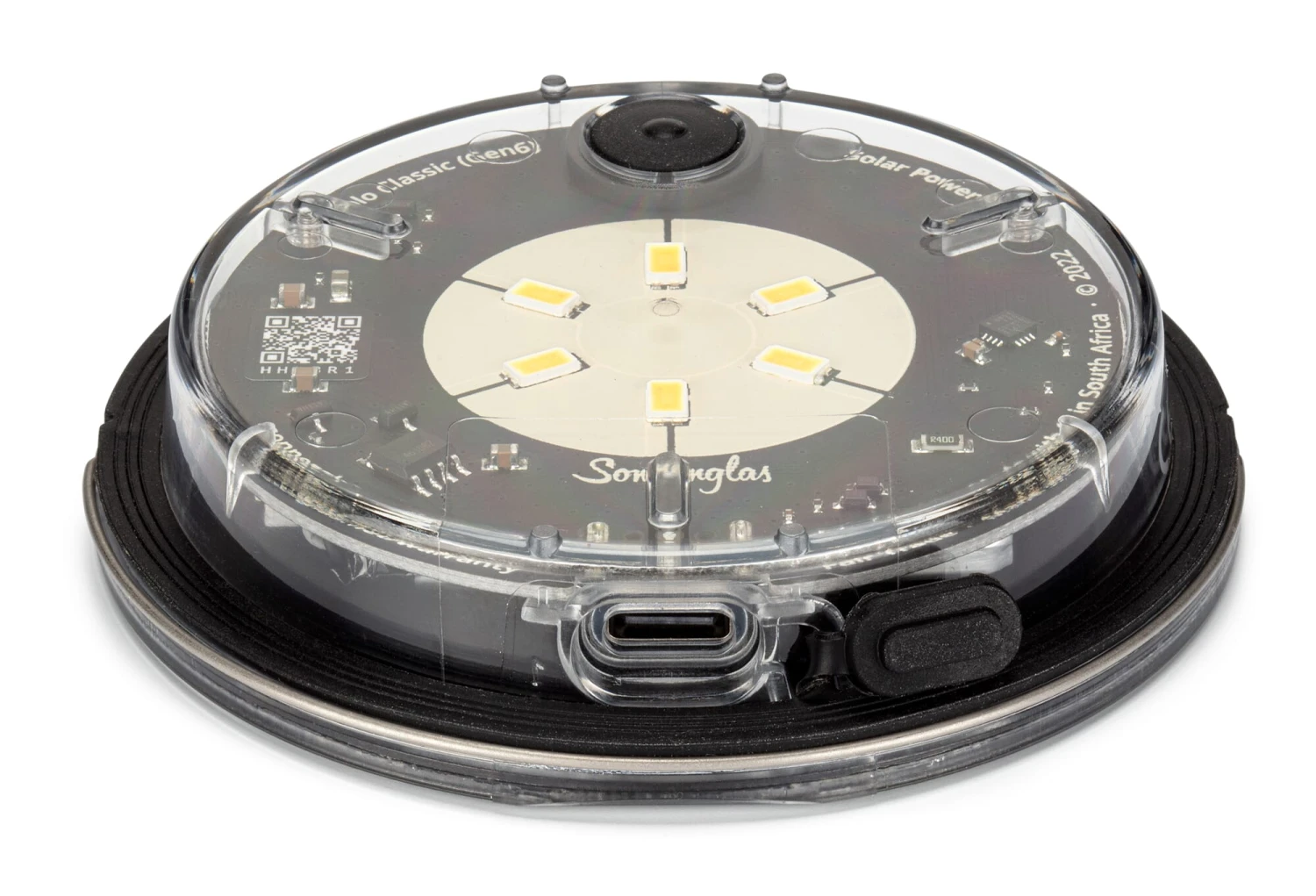 Das Solarmodul der Tischleuchte SONNENGLAS® ist auch ohne Glasbehälter voll funktionsfähig. Es kann als kleine Handlampe genutzt werden und passt in jede Hosentasche. Auch lässt sich mit ihm der SONNENGLAS®-Effekt mit vielen anderen Glasbehältnissen realisieren. Über den Bedienknopf kann es an- und ausgeschaltet werden, ebenso verfügt es über eine Notlichtfunktion, bei der die LEDs blinken.