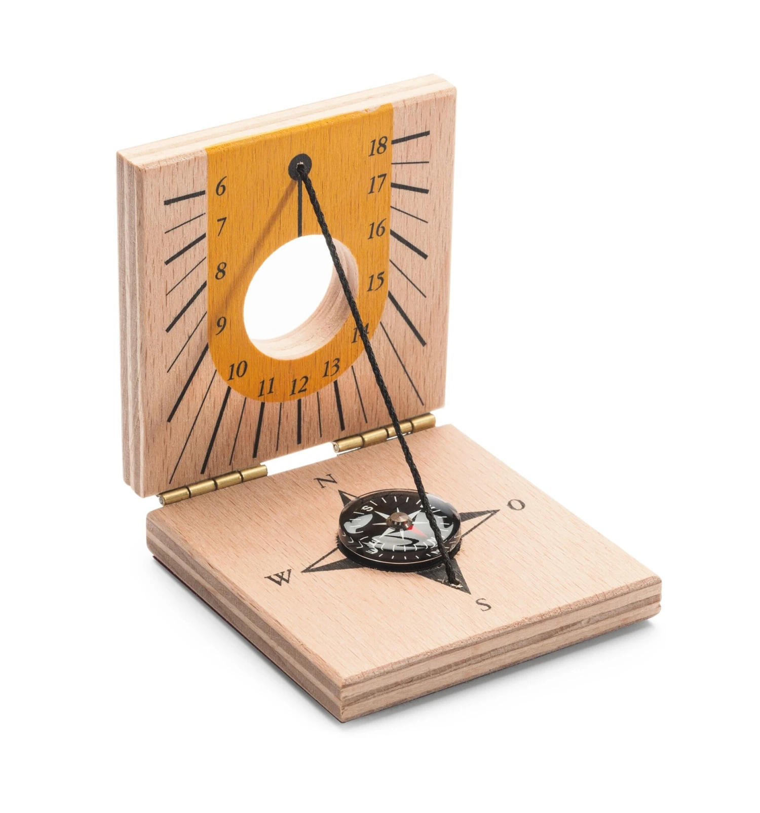 Drehen lässt sich an dieser Uhr nichts, lediglich die Kompassnadel dreht, angetrieben vom Magnetfeld der Erde. Mit ihrer Hilfe lässt sich die Sonnenuhr ausrichten, um die Uhrzeit abzulesen und nebenbei das dahinterstehende Prinzip zu verstehen. Beachtet werden muss allerdings, dass Sonnenuhren immer die sogenannte wahre Ortszeit anzeigen, die von der mitteleuropäischen Zeit je nach Standort differiert: Je weiter man sich westlich des 15. Längengrades befindet, desto mehr geht die Sonnenuhr nach. Zudem entstehen Abweichungen in Richtung Norden und Süden, weil die Sonnenstrahlen nicht überall im selben Einfallswinkel auftreffen. Unsere Sonnenuhr ist für die geographische Breite von 51° berechnet, also ungefähr die Mitte Deutschlands (auf dieser Breite liegen zum Beispiel die Städte Köln oder Dresden), sodass die Abweichung nur gering ist. In der Sommerzeit ist natürlich eine Stunde hinzuzuzählen.