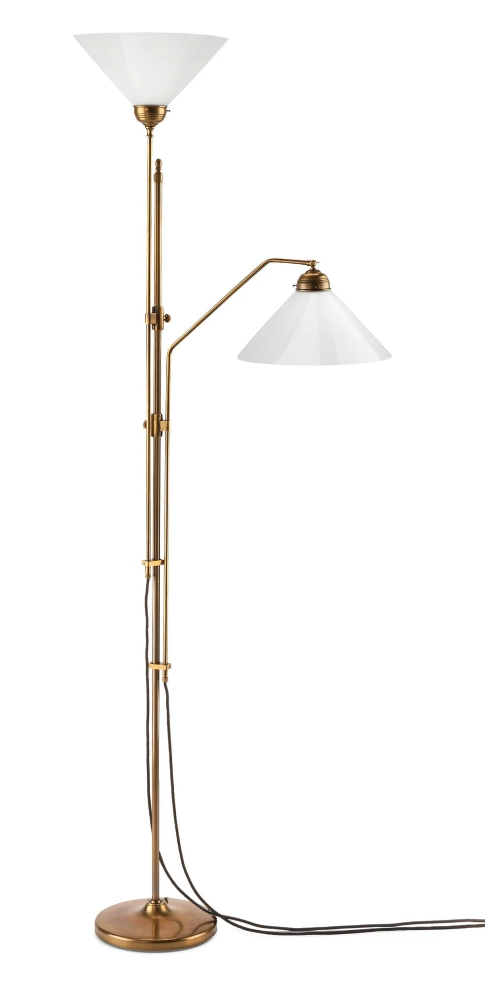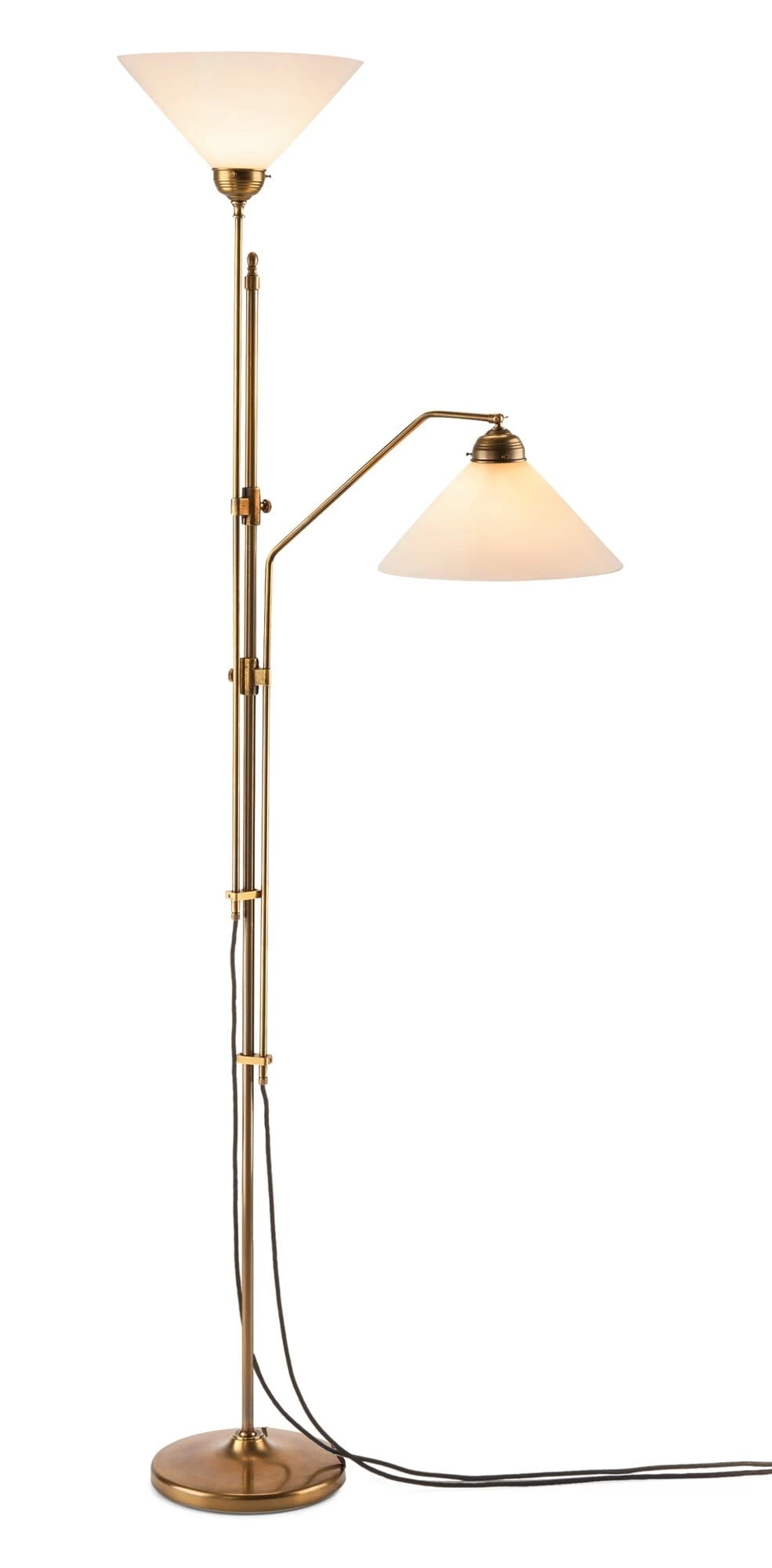 Wir finden: Diese Standleuchte ist eine der schönsten. Deckenfluter und Leseleuchte in einem, in einer zeitlosen Form und aufwendig verarbeitet. Die Höhe beider Schirmträger der Standleuchte lässt sich verstellen: Leseleuchte von 74–140 cm, Deckenfluter von 1,7–2 m Höhe.