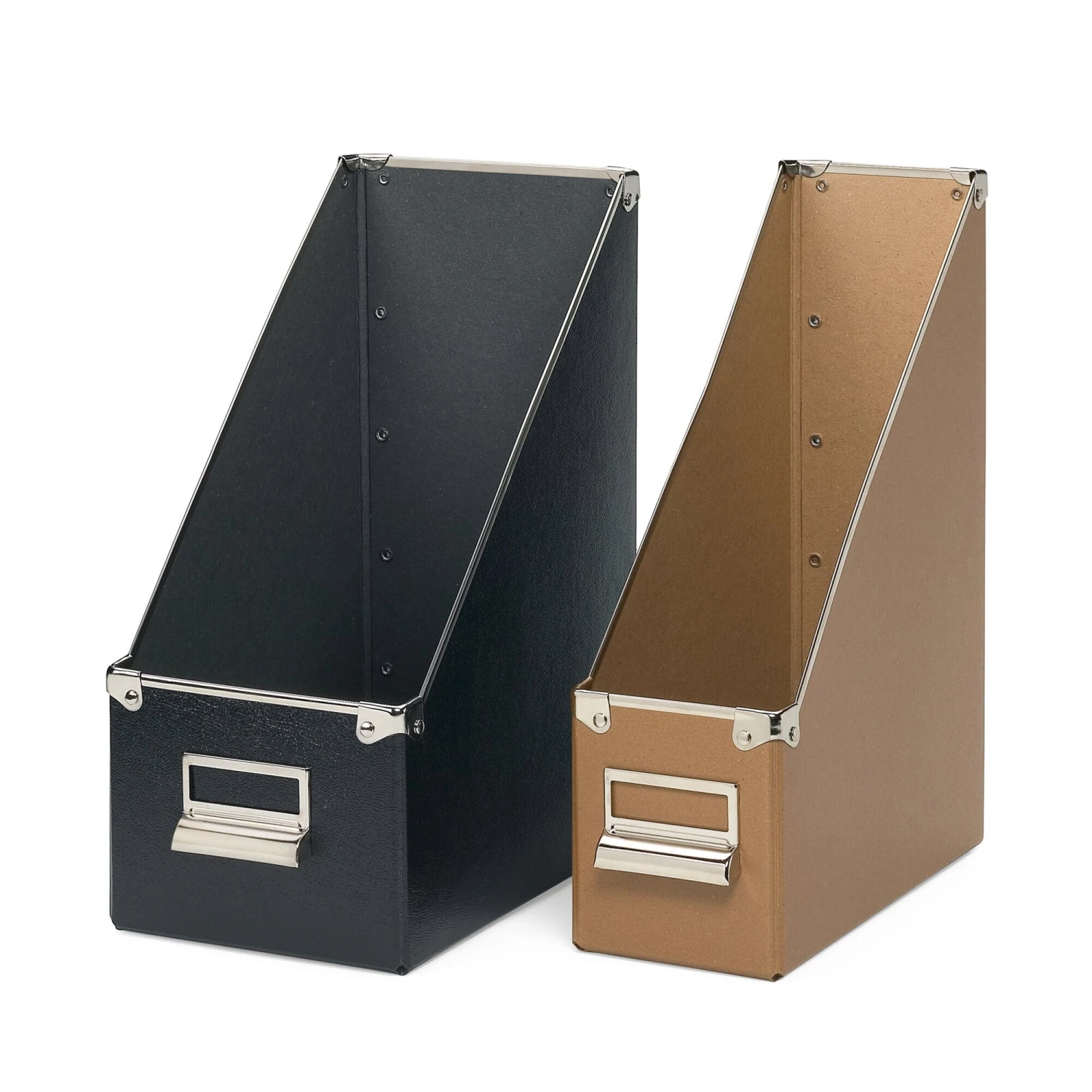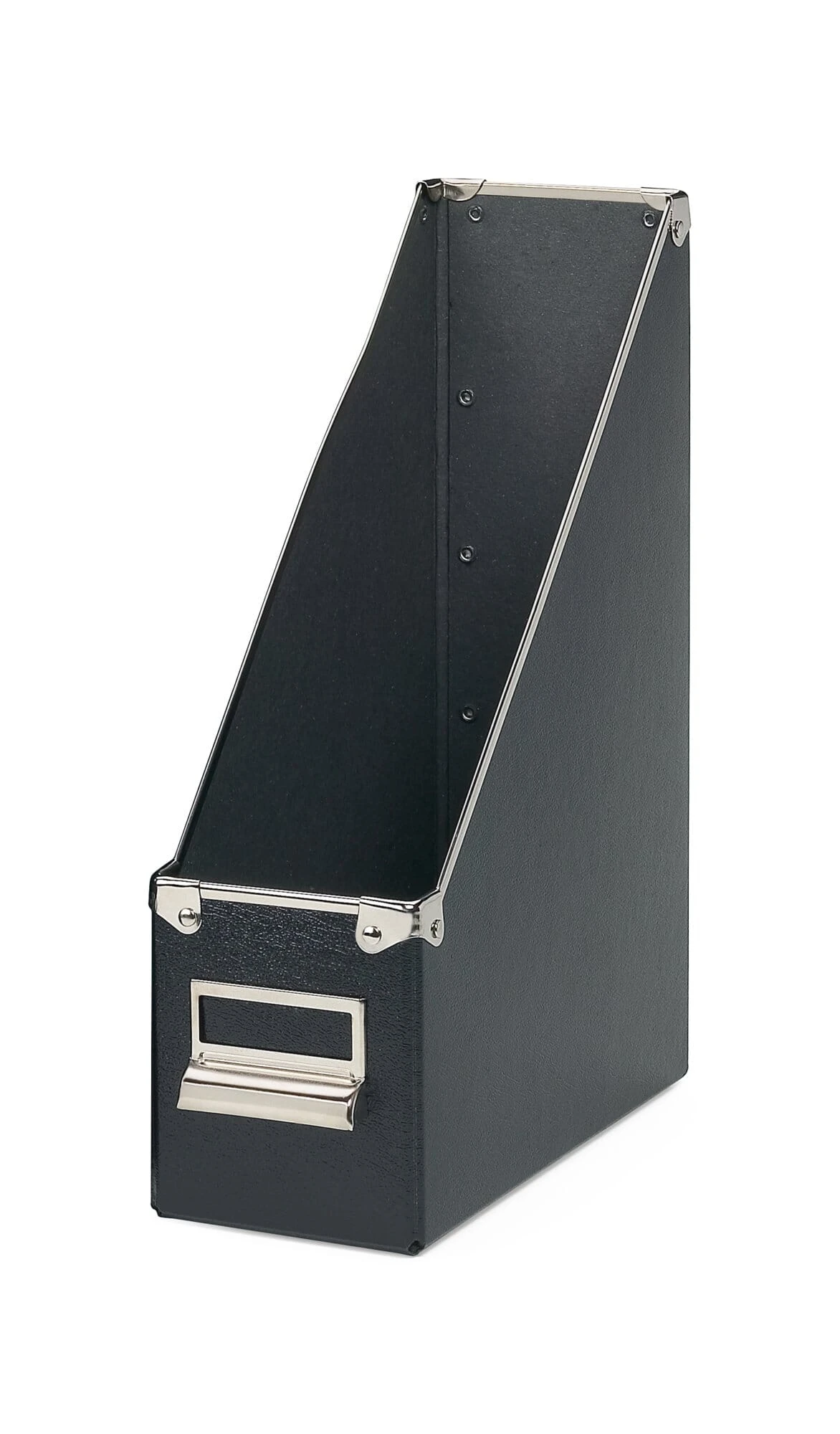 Genietete und durch Stahlblechbeschläge ausgesprochen unverwüstlicher Standordner mit einem Griff an der Vorderseite, der ein Beschriftungsschildchen aufnimmt.