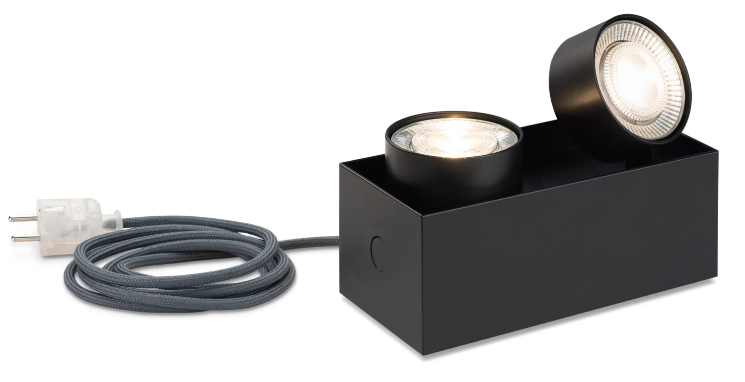 Hier wird der Decken- und Wandaufbaustrahler zur aufstellbaren Einzelleuchte. Der Strahlertyp DRUFF leistet überall dort seinen Dienst, wo von unten wirkende Akzentbeleuchtung gewünscht ist, oder einfach dort, wo die Stromzufuhr nicht über Wand- oder Deckenauslässe gewährleistet ist. DRUFF steht auf dem Boden, oben auf dem Sideboard oder im Regal. Aufwendiges Gehäuse, schön gefertigt, ohne sichtbare Schrauben und Kabel. Die um 365 Grad drehbaren und 90 Grad zu schwenkenden Strahlerköpfe sitzen leicht versenkt auf dem rechteckigen Gehäuse auf. Mit einem Griff lässt sich der gesamte Lichtkopf dank eines patentierten Bajonetts zur Wartung vom Gehäuse lösen. Der Lichtaustrittswinkel der Leuchtmittel liegt bei 12 Grad und erzeugt damit ein punktuelles Licht. Im Lieferumfang enthalten sind zwei Aufsatzlinsen, deren Einsatz einen Lichtausfall von 38 Grad erzeugt und die somit breit abstrahlen. Kabel: L 230 cm, Schutzkontaktstecker (Typ F) . Die Leuchte enthält LED-Lampen. Lichtstrom: 1.100 lm, Farbtemperatur: 2.700 K, Farbwiedergabe (CRI > 90), Nennleistung: 2 x 12,7 W. Tauschbare Wechseloptiken mit 12° und 38° Abstrahlwinkel.