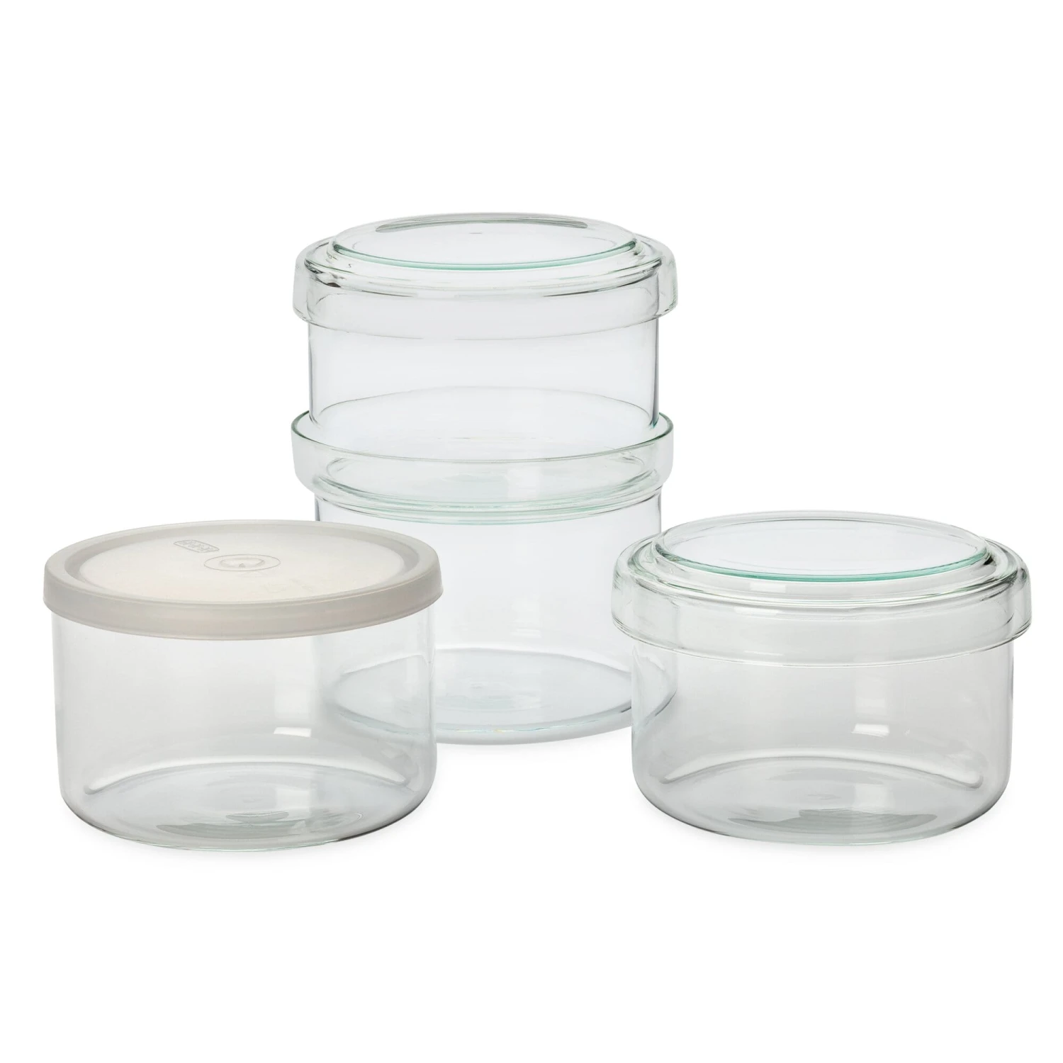 Jenaer Borosilikatglas – hitzebeständig, leicht und robust, formschön und gut zu handhaben. Die über die ausgeformten Deckel stapelbaren Vorratsdosen – wir liefern sie in Sets – lassen sich mit ihrem Durchmesser von 115 Millimetern gut auch von kleinen Händen greifen. Wir liefern mit Glasdeckel sowie dem fest verschließbaren Kunststoffdeckel. Für die Spülmaschine geeignet.