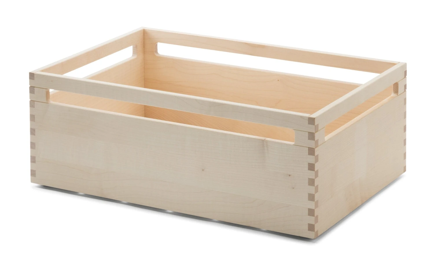 Diese Ahornholz-Kisten stehen formschlüssig und sicher aufeinander, bevorzugt im Küchenregal oder im Vorrat, wo sie in sich ein weiteres kleines Regal bilden können und vorhalten, was auch immer Sie ihnen anzuvertrauen gedenken. Sogar Obst und Gemüse können Sie darin lagern, da der Kistenboden jeweils aus einer Anzahl etwas breiterer Leisten besteht und eine gute Belüftung von unten somit sichergestellt ist. Aus dem Stapel herausgelöst, eignen die Kisten sich sogar als Tablett mit hohem Rand und sind an den umlaufenden Leisten sicher zu greifen. Bemerkenswert ist ihre Verarbeitung, denn die Seitenteile sind über Eck klassisch durch Fingerzinken gesichert (und nicht einfach nur verleimt). Der Hersteller in Slowenien setzt ausschließlich Holz europäischer Herkunft ein. Ahorn eignet sich aufgrund seiner Härte und Widerstandsfähigkeit besonders für diesen Zweck, pflegeleicht wie es ist.