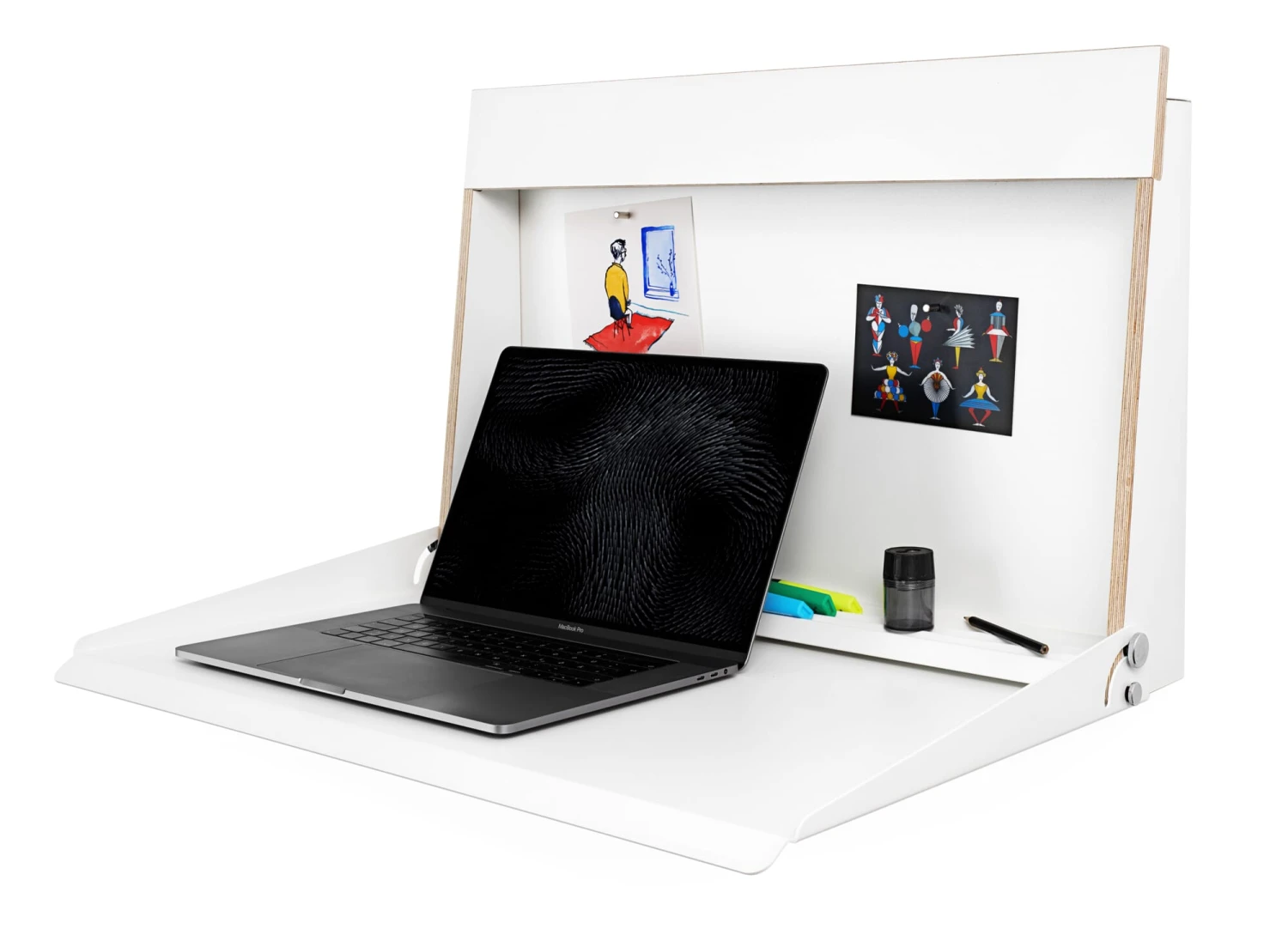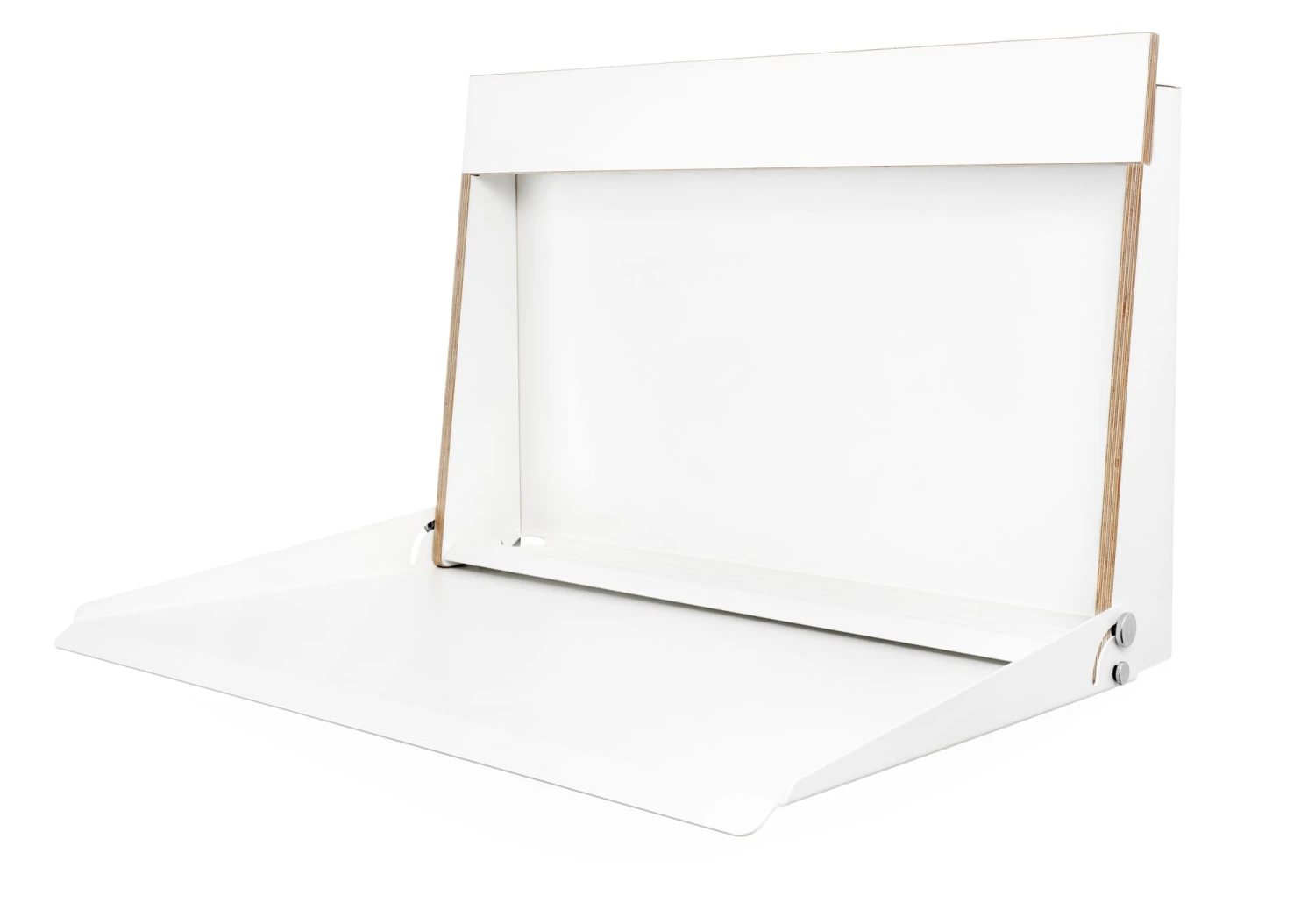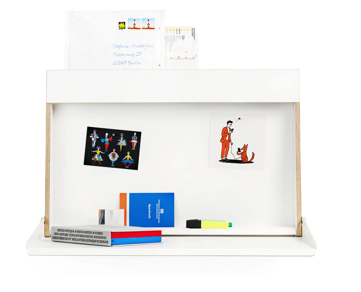 Als Stehpult oder als Wandsekretär: KABINETT ist ein schlankes Möbel mit funktionalem Innenraum und kleiner Arbeitsfläche. Überall dort einsetzbar, wo der Steharbeitsplatz als Ergänzung zum regulären Arbeitstisch gewünscht wird oder wo für den großen Schreibtisch kein Raum vorhanden ist. Die Wandmontage mit nur drei Schrauben ermöglicht eine individuelle Anbringung auf Steh- oder Sitzhöhe. Aufgeklappt bietet die so entstehende „Mini Workstation“ Raum für einen Laptop oder auch für einen aufgeschlagenen Aktenordner. Geschlossen beansprucht KABINETT mit seiner geringen Tiefe kaum Platz und ist doch ein kleines Raumwunder mit durchdachten Details: So dient die Rückwand aus Stahlblech als Pinnwand und die Zick-Zack-Profilierung des Korpusbodens nicht nur als Ablage für Stifte, sondern auch als Kippsicherung für den hochkant gestellten Laptop, den Tabletrechner oder Papier. KABINETT besteht aus einem Rahmen aus Schichtholz, einer Stabilität gebenden stählernen Rückwand und einem Klappdeckel aus Aluminium. Die Konstruktion des Deckels ist über den sichtbaren Drehpunkt deutlich ablesbar und stellt sich als schönes Detail dar. Wir liefern ergänzend zur Elektrifizierung eine spezielle Mehrfachsteckdose (Artikelnr. 37864), deren Zuleitung durch eine entsprechende Kabelöffnung (Ø 4 cm) im Korpus geführt werden kann.