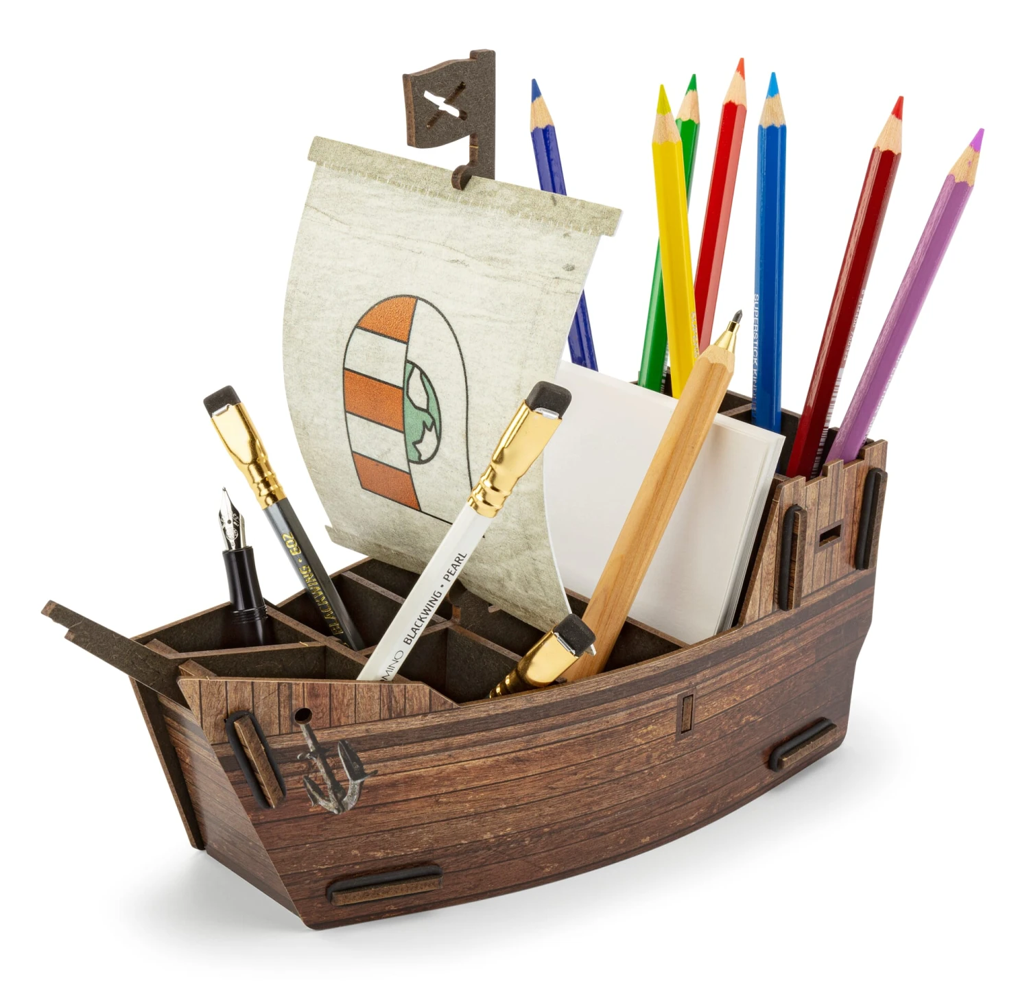 Die Stifteboxen von Werkhaus erweisen sich als überaus praktischer Ordnungshüter auf dem Schreibtisch. Neben Stiften und Büroutensilien findet hier auch allerhand anderer Kleinkram (wie etwa Werkzeug) Platz. Also alle Mann an Bord! Und sollte die Schreibtischarbeit einmal ins Stocken geraten, verhilft vielleicht der spielerische Einsatz der erstaunlich detailgetreu ausgeführten Kogge auch den Denkprozessen zu neuer Agilität.