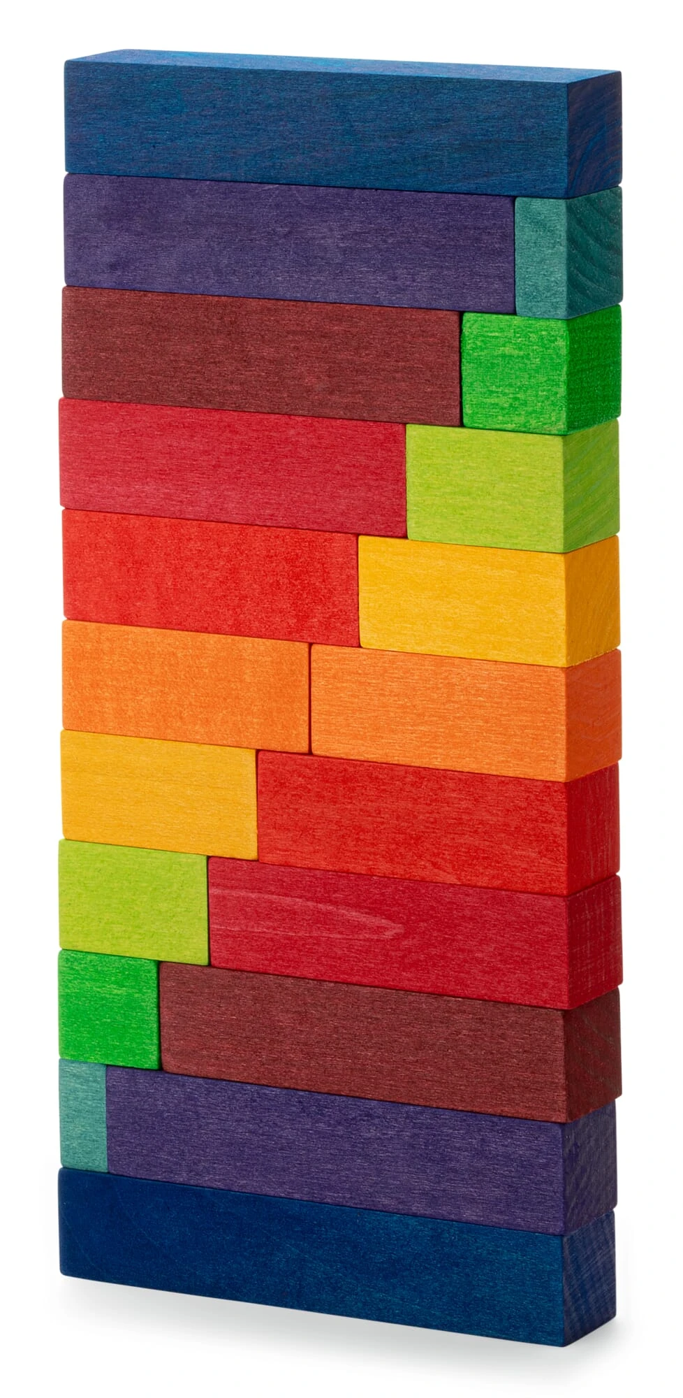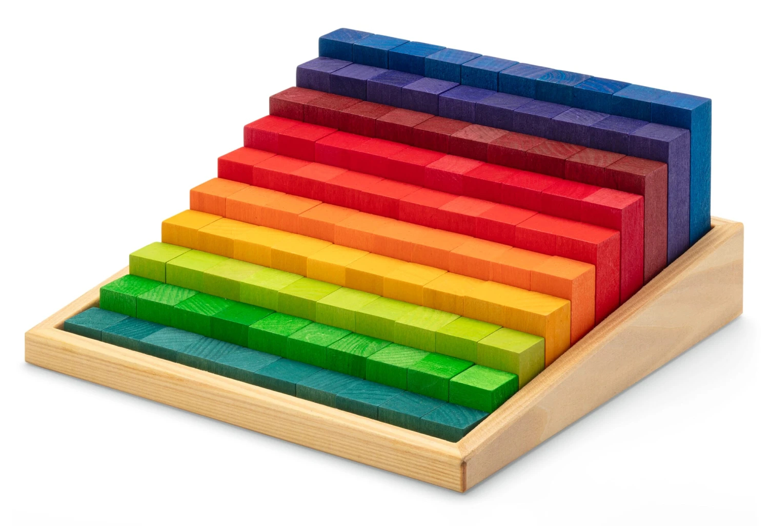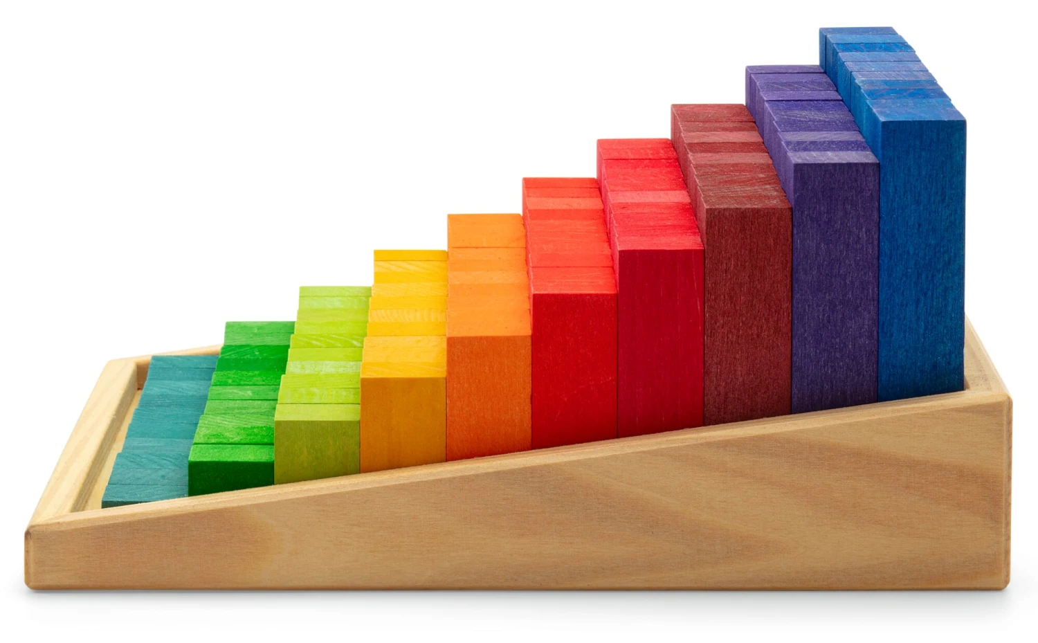 Das Verhältnis von Größen und Mengen zueinander veranschaulichen die Stufenzählsteine, in Höhen von ein bis zehn Zentimeter gestaffelt, auf spielerisch-konstruktive Art und Weise. Eins ist immer gleich mit eins, zwei mit zwei, zehn mit zehn, und zwei und sechs ergeben dieselbe Höhe – also Menge – wie drei und fünf. Und dank der fröhlich bunten Lasur – jeder Höhe ist eine eigene Regenbogenfarbe zugeordnet – bleiben die Untermengen stets deutlich sichtbar.