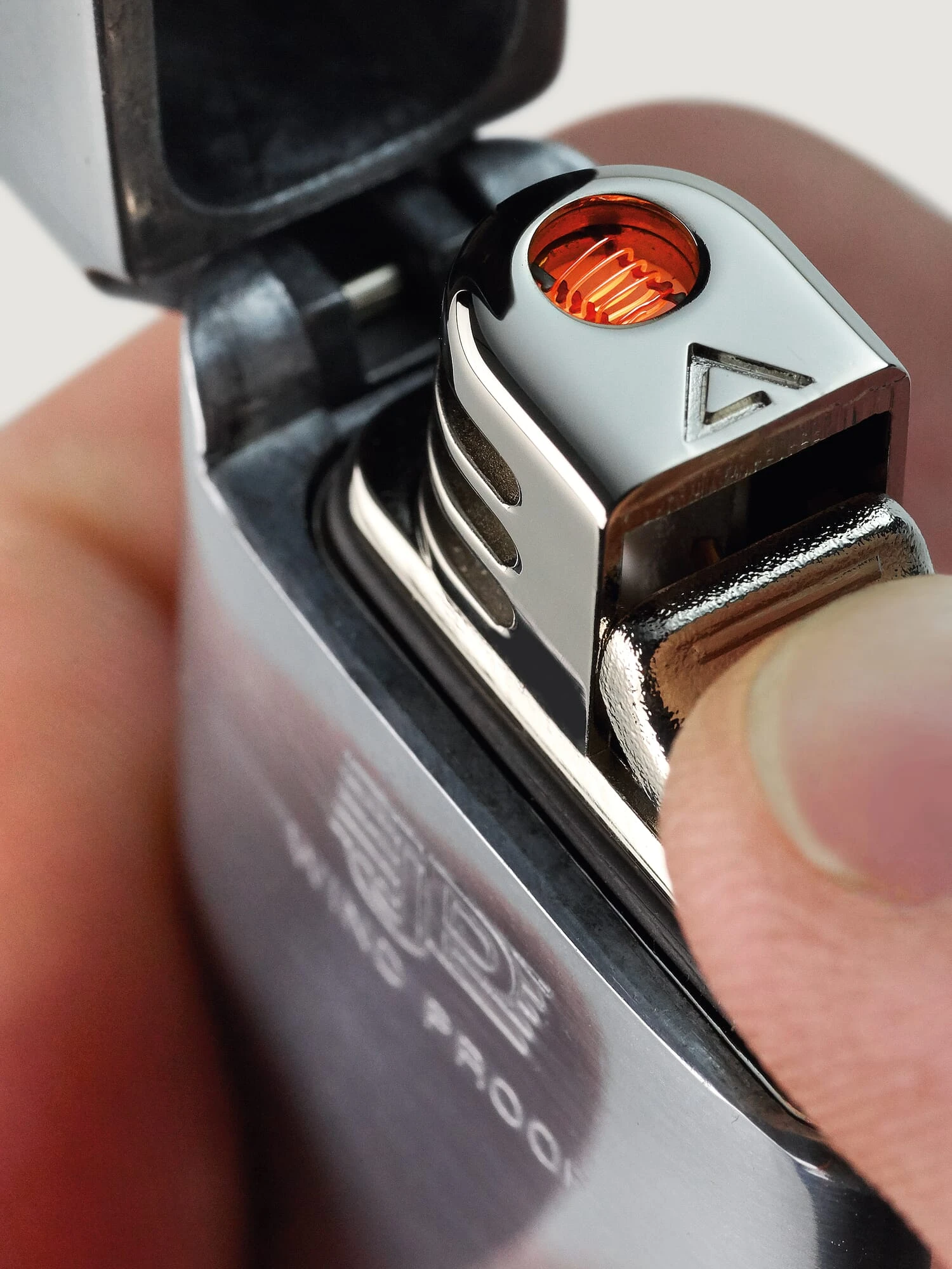 Im Unterschied zum Steinfeuerzeug, bei dem Gas oder Benzin durch einen via Reibrad und Feuerstein einmalig erzeugten Funken entzündet werden, bedient sich dieses Glutpunktfeuerzeug eines ganz anderen Systems: Ein über dem Auslass des Butangastanks platziertes Drahtgitter wird von der durch Piezo-Zündung initialisierten Flamme erhitzt, woraufhin das durchströmende Gas-Luft-Gemisch permanent entzündet wird. Diese 1983 in Japan entwickelte Technik gewährleistet absolute Resistenz gegen das Verlöschen der Flamme. Diese brennt blau, also entsprechend heiß, und leuchtet kaum. Eine Einschränkung gibt es jedoch: Bei Umgebungstemperaturen weit unter 0 °C funktioniert das Prinzip nicht, weil der Dampfdruck des Butangases dann nicht mehr für eine konstante Verbrennung ausreicht. Hergestellt wird das Feuerzeug von Windmill, einem japanischen Spezialisten, der etwa auch die IMCO-Feuerzeuge aus unserem Sortiment produziert. Die Einfüllöffnung für den Gastank liegt unter der mit einem Schlüsselring versehenen Abdeckschraube, an gleicher Stelle kann die Höhe der Flamme reguliert werden.