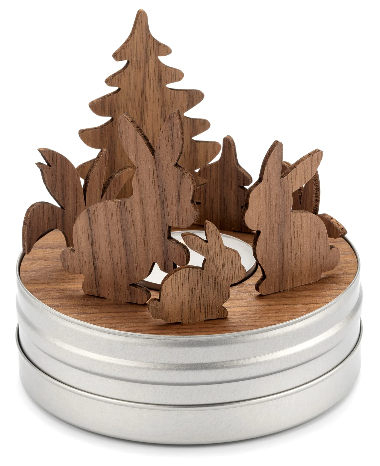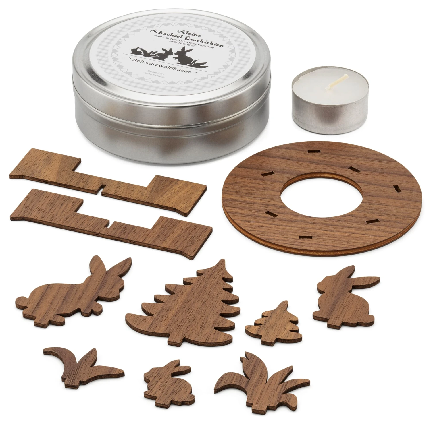 Ebenso exakt sind in das Nussbaumholz der Bodenplatte die Nuten gefräst, in welche die Schwarzwälder Hasenfamilie, die Bäume und Sträucher eingesteckt werden. Licht, Schattenwurf und Reflexion des mittig in der Bodenplatte platzierten Teelichts hauchen der Szenerie stimmungsvoll Leben ein. Da die Anordnung der Figuren variabel ist, führen Sie Regie und können die Protagonisten mitsamt Kulisse jederzeit neu aufstellen – in diesem kleinen, aber feinen Bühnenbild, das sich in der Metalldose zusammengelegt überallhin transportieren (und verschenken) lässt. Auch ein kleines Booklet, das eine phantasievolle Geschichte zu der Szene erzählt, liegt dem Teelichthalter bei.