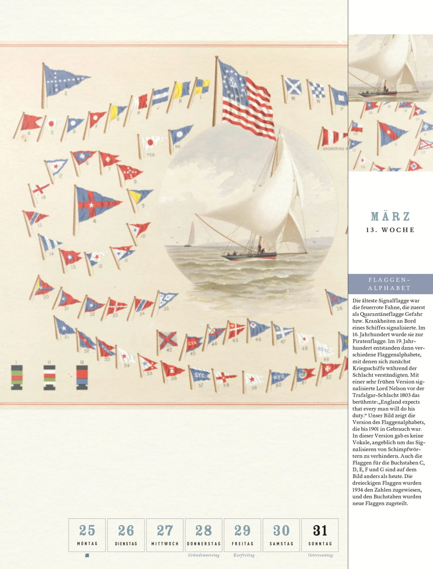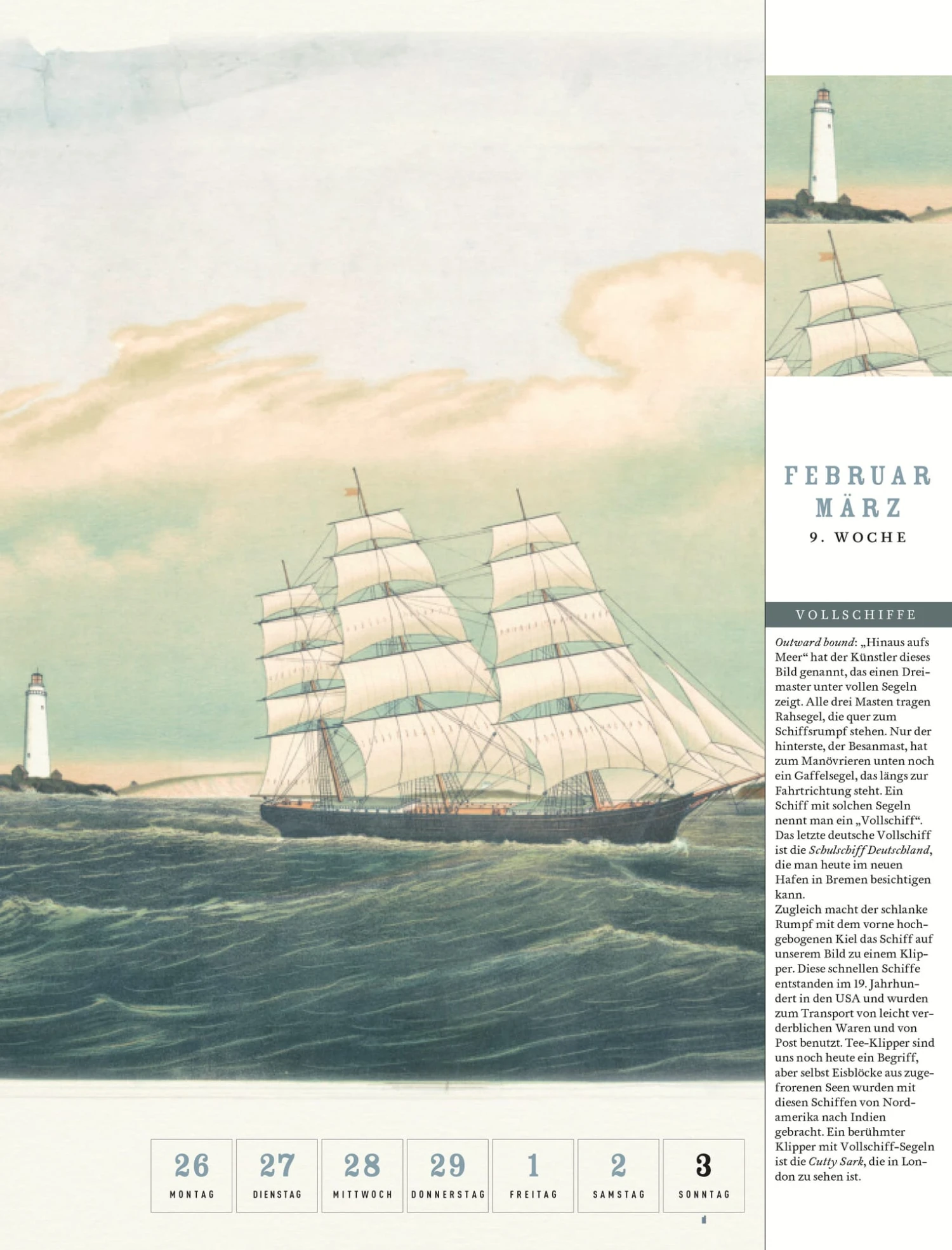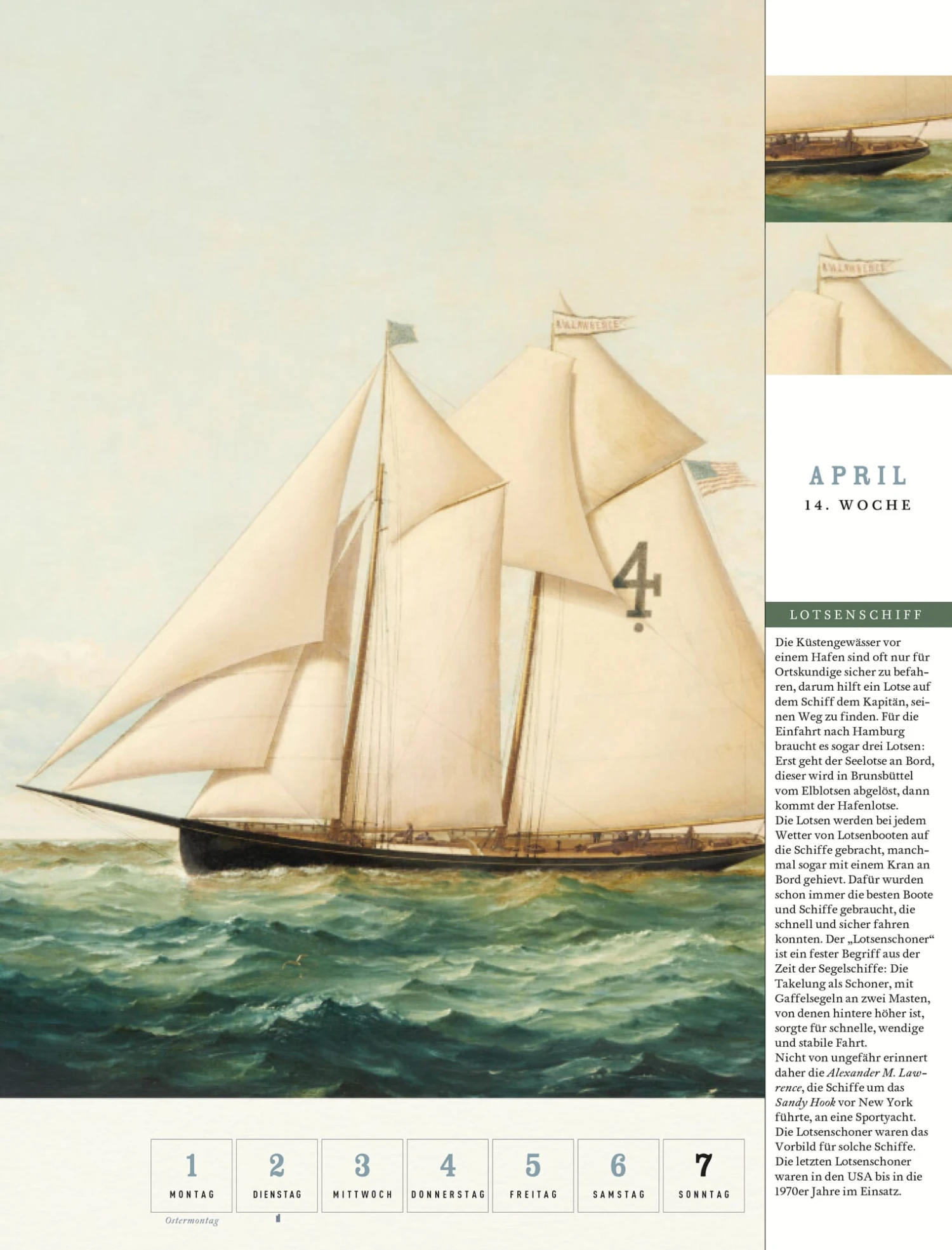 Von Plattbodenschiffen und Ozeanlinern, von Fischfang, frühen Expeditionen auf den Weltmeeren und Sommerfrische an der Nordsee handelt dieser Kalender aus dem Thorbecke Verlag. So beginnt das Jahr 2024 als eine Reise in längst vergangene, doch immer noch faszinierende Welten: historische Seekarten, frühe Werbeplakate und Zeichnungen von Segelschiffen aus allen Jahrhunderten weisen uns den Schifffahrtsweg. Die Verbindung von Seefahrerei und Entdeckergeist, wilder Schönheit der Ozeane und Technikbegeisterung fanden wir Menschen schließlich schon immer überaus spannend, wie nicht nur die kenntnisreich-unterhaltsam gestalteten Kalendertexte beweisen. Die versammelten Abbildungen stammen sämtlich aus historischen Quellen, etwa aus „A chart of the East Sea“ von Samuel Thornton aus dem Jahr 1702, heute in der New York Public Library archiviert, oder aus dem Hamburgischen Album von 1860, herausgegeben von Bernhard S. Berendsohn und James Gray.