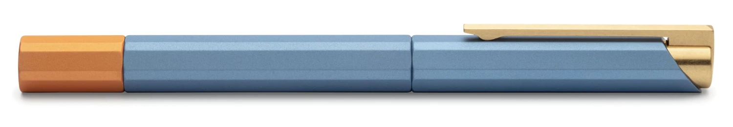 Außergewöhnlich in Form und Farbgebung ist dieser Tintenroller des taiwanischen Herstellers YStudio. Gestalterische und auch haptische Besonderheit des im Querschnitt hexagonalen Aluminiumgehäuses sind die gefasten Kanten. Dadurch liegt der an sich bereits gut ausbalancierte Stift noch angenehmer in der Hand. Gleichsam elegant wie auffallend sind die Farbkombinationen: Der in kräftigem Grün, Blau oder Rot eloxierte Korpus wird von einem glanzpolierten Messing-Clip und einem kontrastfarbenen Endstück in Rosé, Orange oder Messingfarbe eingefasst.
