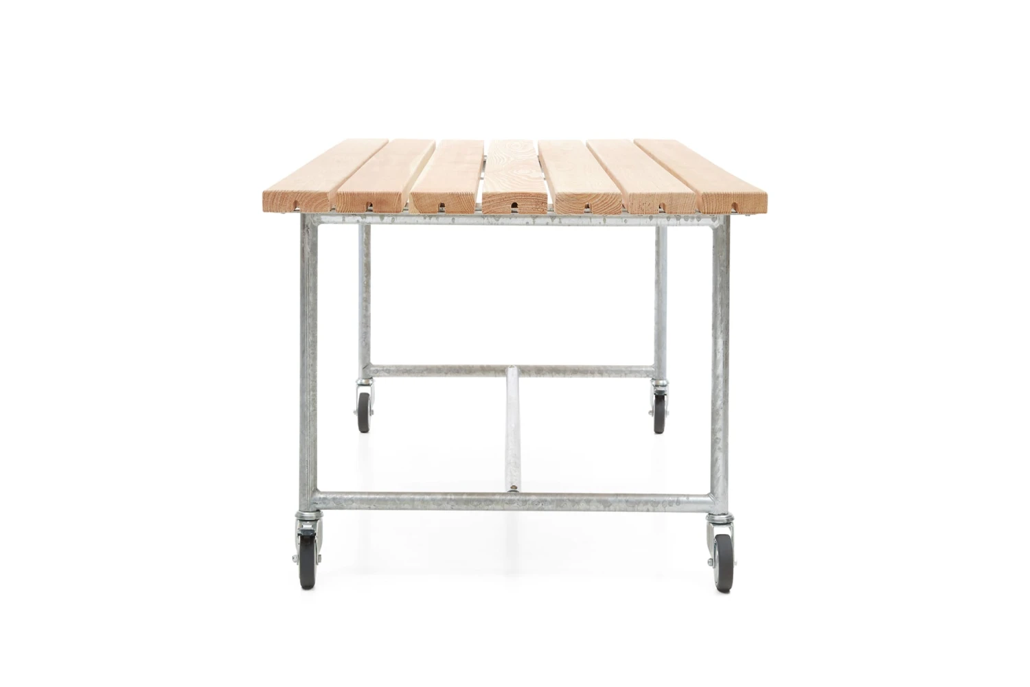 Material: Rahmen: Stahl, feuerverzinkt; Beplankung: Lärche, unbehandelt FSC® (Herkunft: Lettland); Rollen: Stahl, verzinkt, gummibelegt