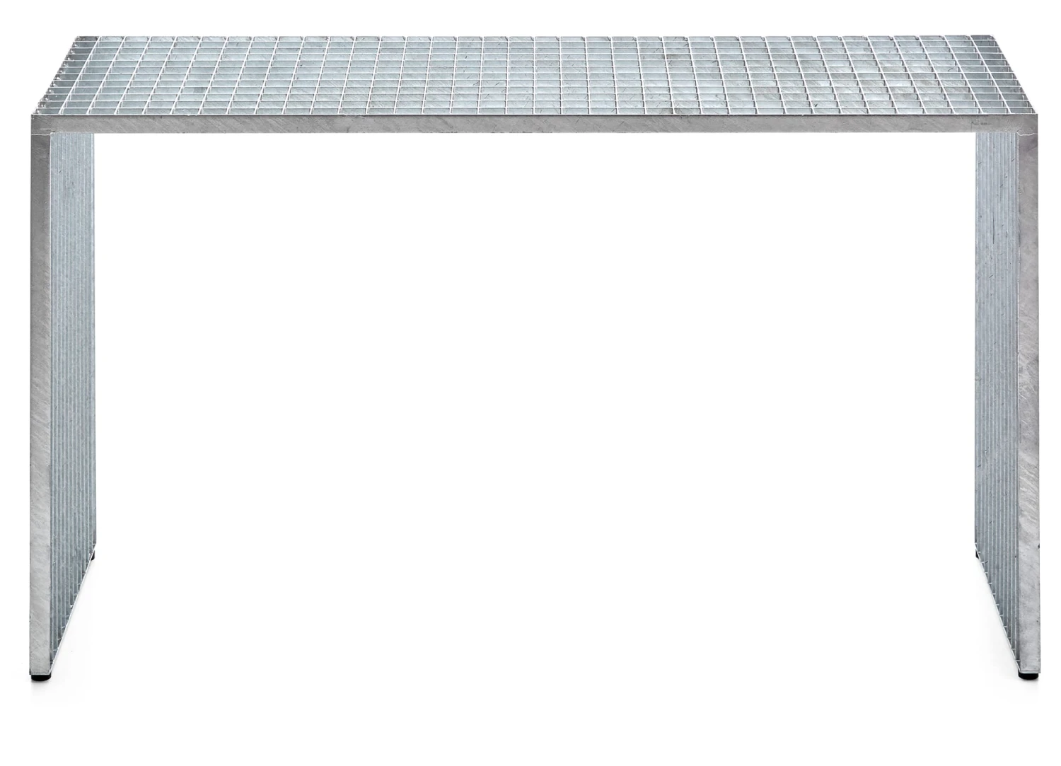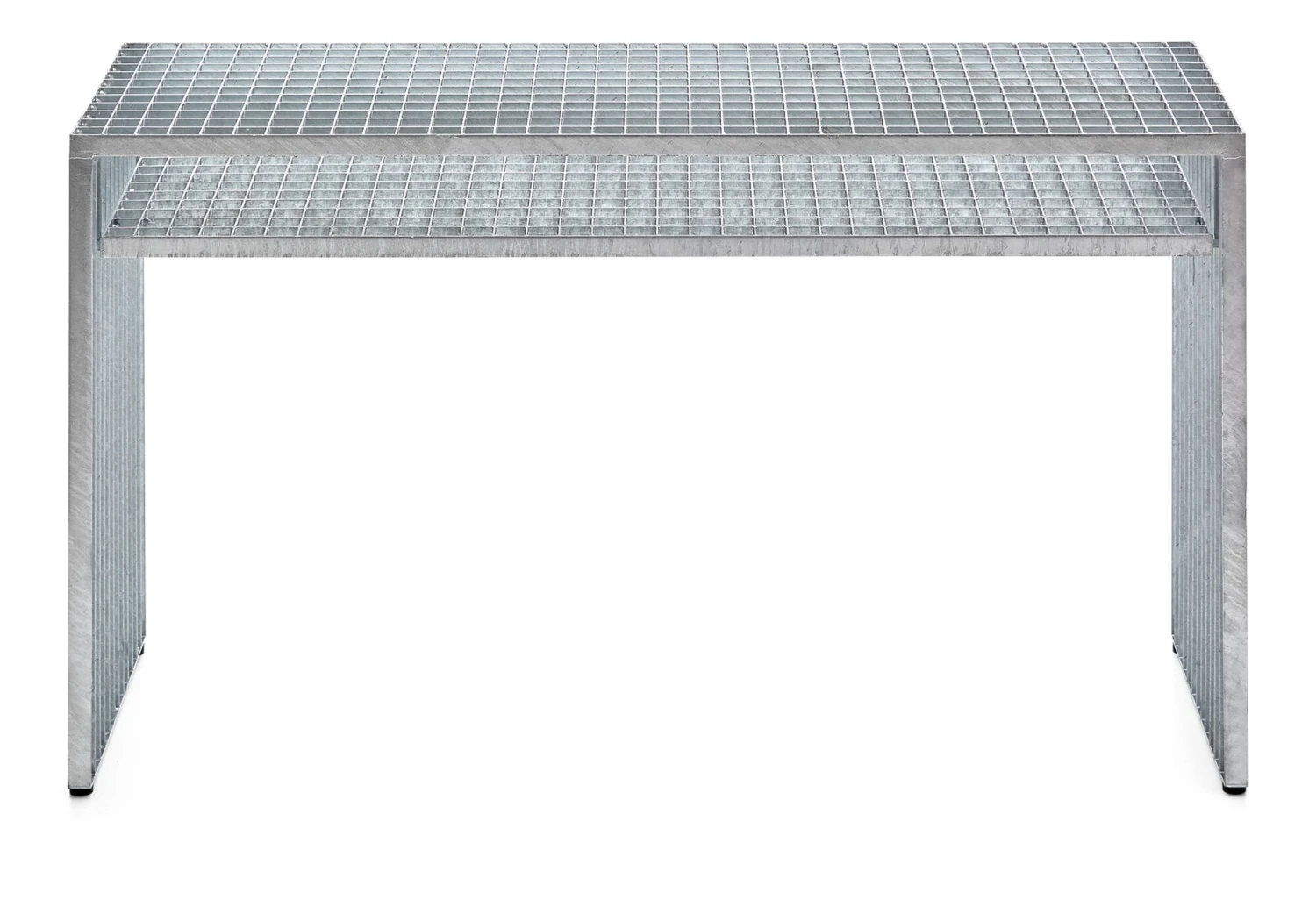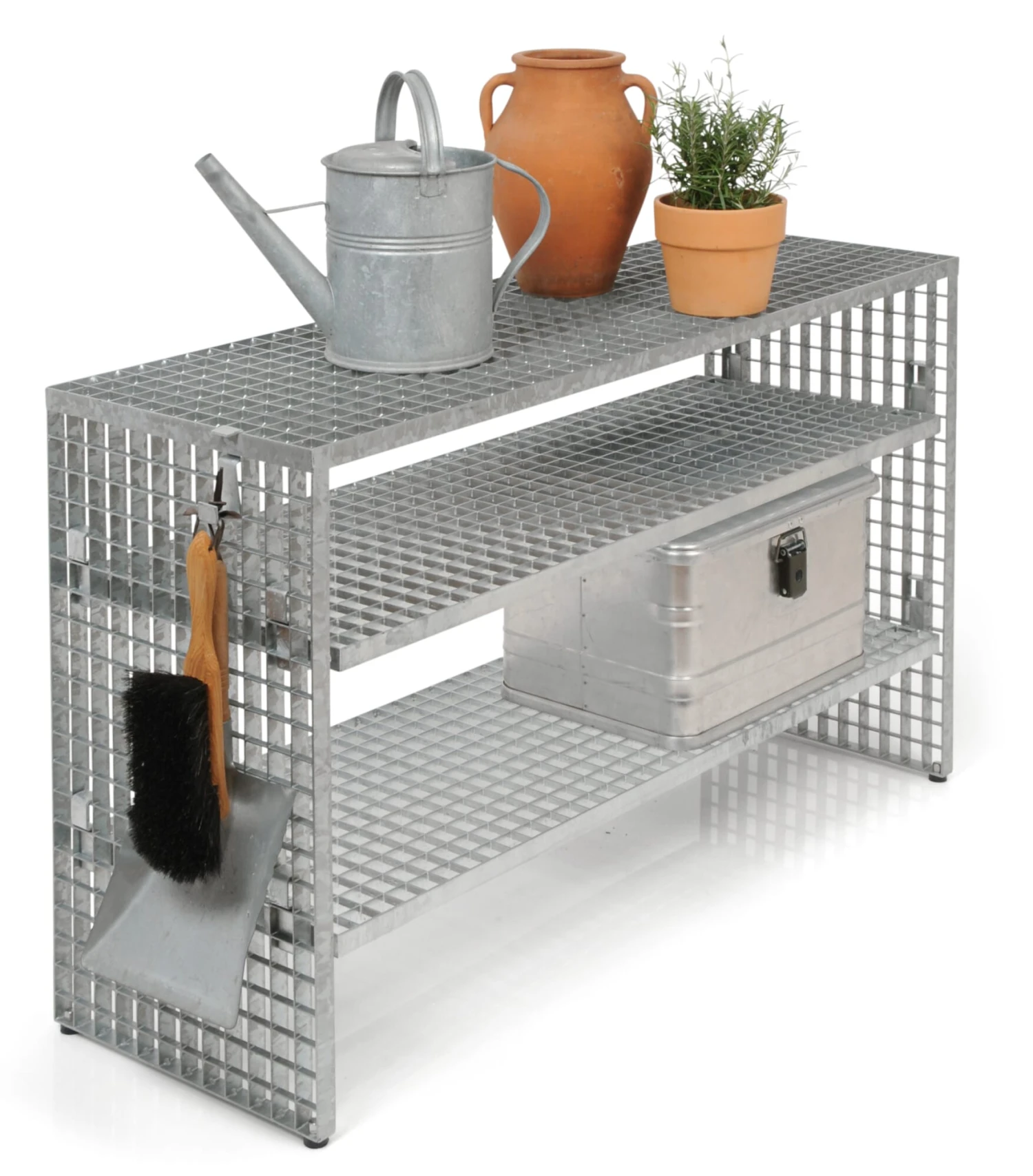 Mit Ecken und Kanten und in unverwüstlicher Industriequalität: universell einsetzbarer Tisch – als Möblierung von Garten und Terrasse, zur Ergänzung vorhandener Sitzmöbel oder auch als Regalelement bei der Bepflanzung von Terrasse oder Balkon, wobei ein separat einsetzbarer Fachboden für ergänzenden Stauraum sorgen kann.