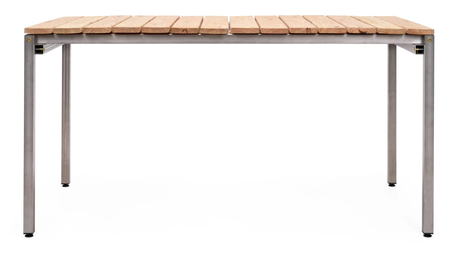 ERIK – ein vielseitiges Tischgestell, das durch seine Stabilität überzeugt. Hier in der Version aus Edelstahl – wer’s genau wissen will aus V2A Chrom-Nickel-Stahl mit der Werkstoffnummer 1.4301, säurebeständig. Es besitzt die guten gestalterischen Merkmale der farbigen Gestelle und besteht aus acht stählernen Quadratrohren, die an den Eckpunkten über Kreuz verschraubt werden. Die außen stehenden Beine schaffen freien Fußraum unter jeder aufzulegenden Tischplatte. Wenn man ERIK im Innenbereich benutzt, ergeben sich durch das frei zu wählende Maß der Platten vielfältige Varianten: ein- oder allseitiger Überstand (wie zum Beispiel 220 × 90 cm), abschließend mit den Außenkanten des Gestells (147 x 77cm) oder sogar zurückspringend mit dann freiliegender Knotenkonstruktion (140 × 70 cm). Die nicht zum Lieferumfang gehörenden Tischplatten sind in jedem Material und fast jeder Größe beliebig zu kombinieren. Wir empfehlen die Linoleumtischplatten aus unserem Sortiment. Mit der speziell für den Einsatz von ERIK NIRO entwickelten Platte mit Douglasienbelattung ist ERIK NIRO ein witterungsbeständiger Tisch für den Außenbereich.