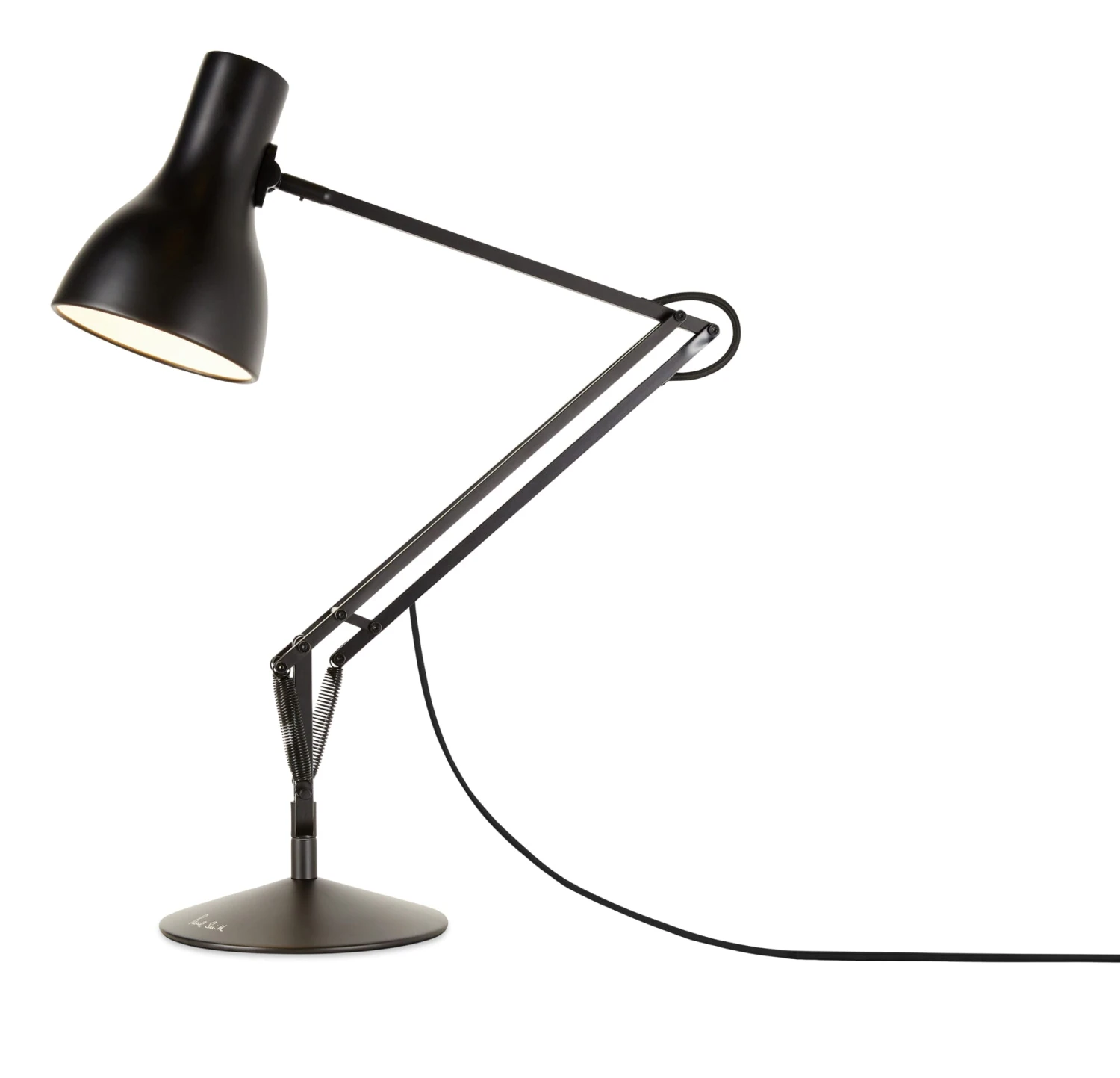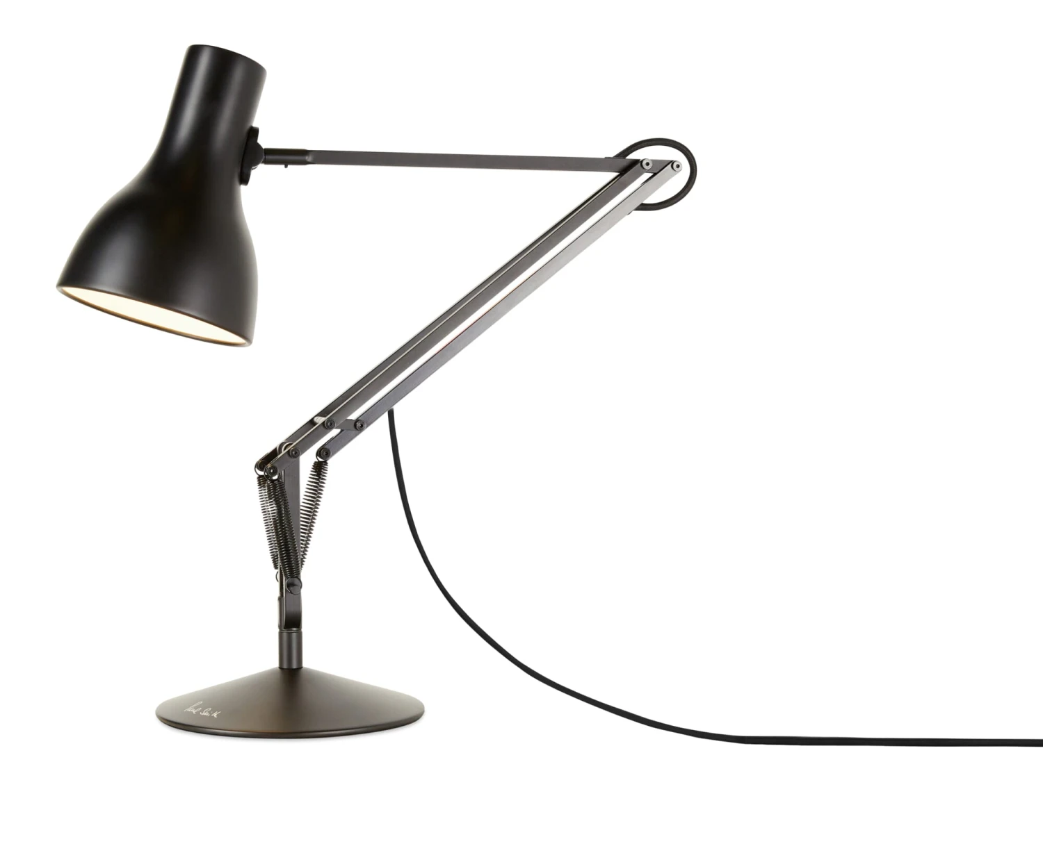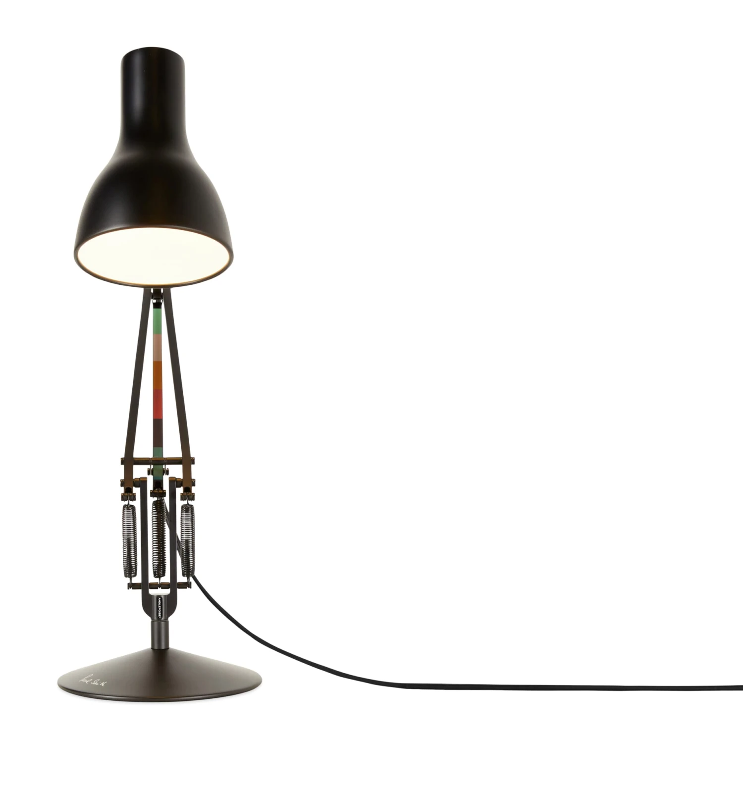 In einer letzten Paul-Smith-Edition zeigt sich die Tischleuchte ANGLEPOISE® in Mattschwarz mit schwarz-vernickelten Beschlägen und einem für Sir Paul typischen raffinierten Farbspiel am mittleren Gelenkarm. Der archetypische Vorläufer dieser Arbeitsleuchte wurde auf Basis der Erfindung eines neuen Zugfedertyps entworfen. Die ANGLEPOISE® TYP 75 stellt die letzte Stufe in der Entwicklung dieses Leuchtentyps dar. Struktur und Schirm sind aus Aluminium gefertigt. Die Leuchte ist stabil, unkompliziert auszurichten und ihr Leuchtenkopf besitzt zusätzlich ein Kugelgelenk. Kabel: L 270 cm, Eurostecker. Fassung: E27. Die Leuchte wird geliefert mit einem LED-Leuchtmittel. Leistungsaufnahme: max. 20 W.