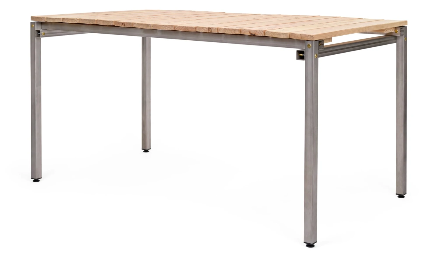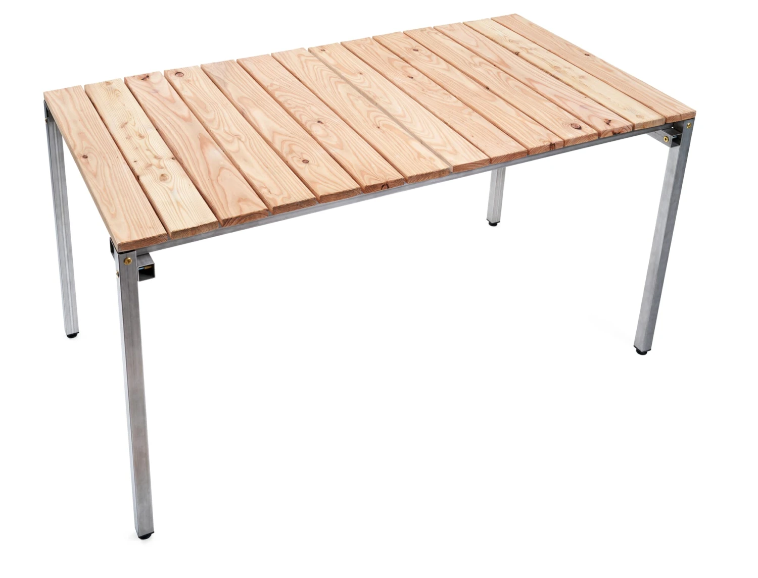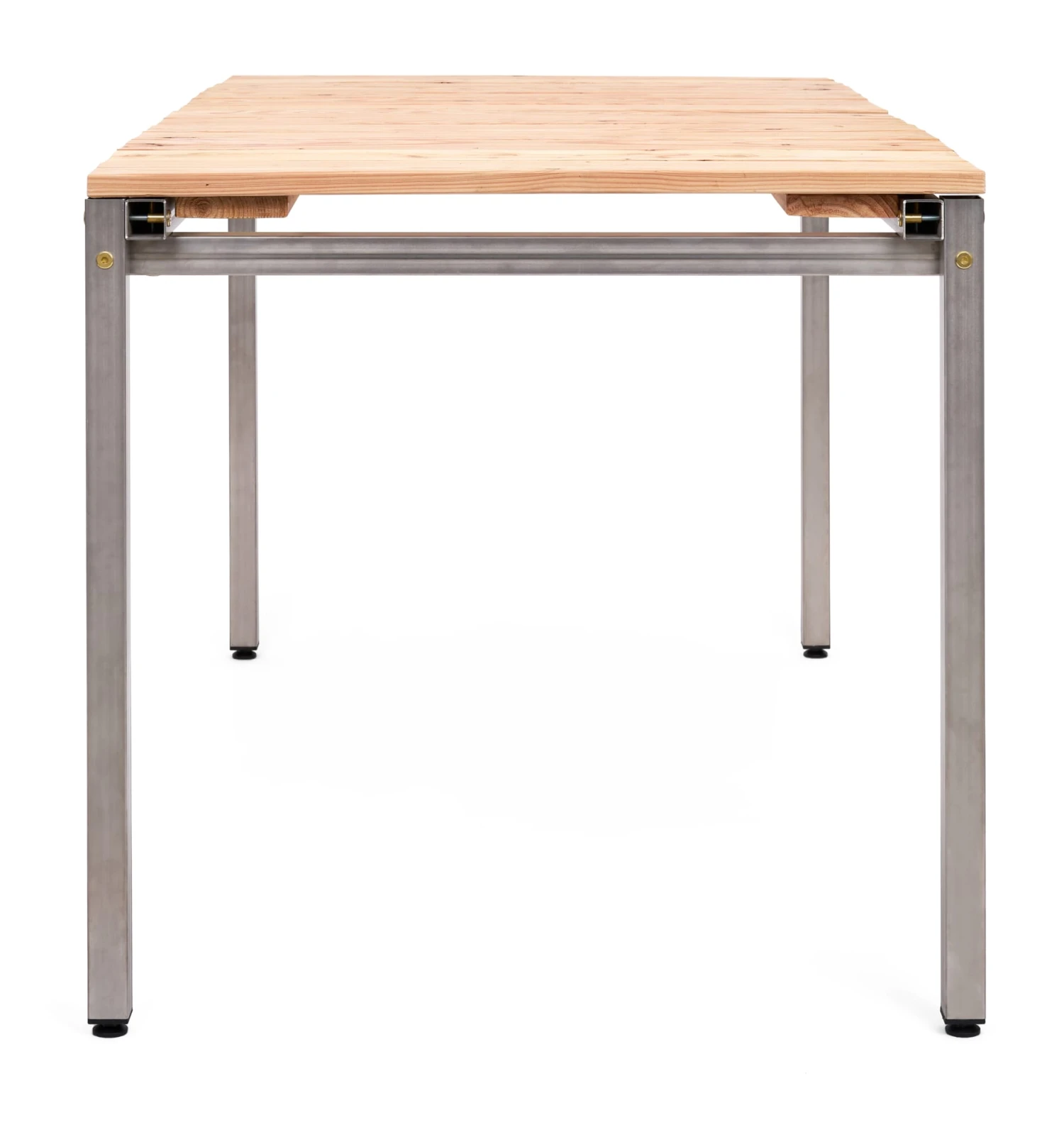 Eine spezielle Tischplatte aus massiver, unbehandelter Douglasie, allseitig gehobelt und gefast, passend zum Tischgestell ERIK NIRO. So wird aus dem Tischgestell in Edelstahl ein wetterfester Außentisch. Die besondere Konstruktion in Brettbauweise ist aus Gründen der besseren Handhabung zweiteilig und wird mit zum Lieferumfang gehörenden Edelstahlschrauben fest mit dem Tischgestell verbunden.