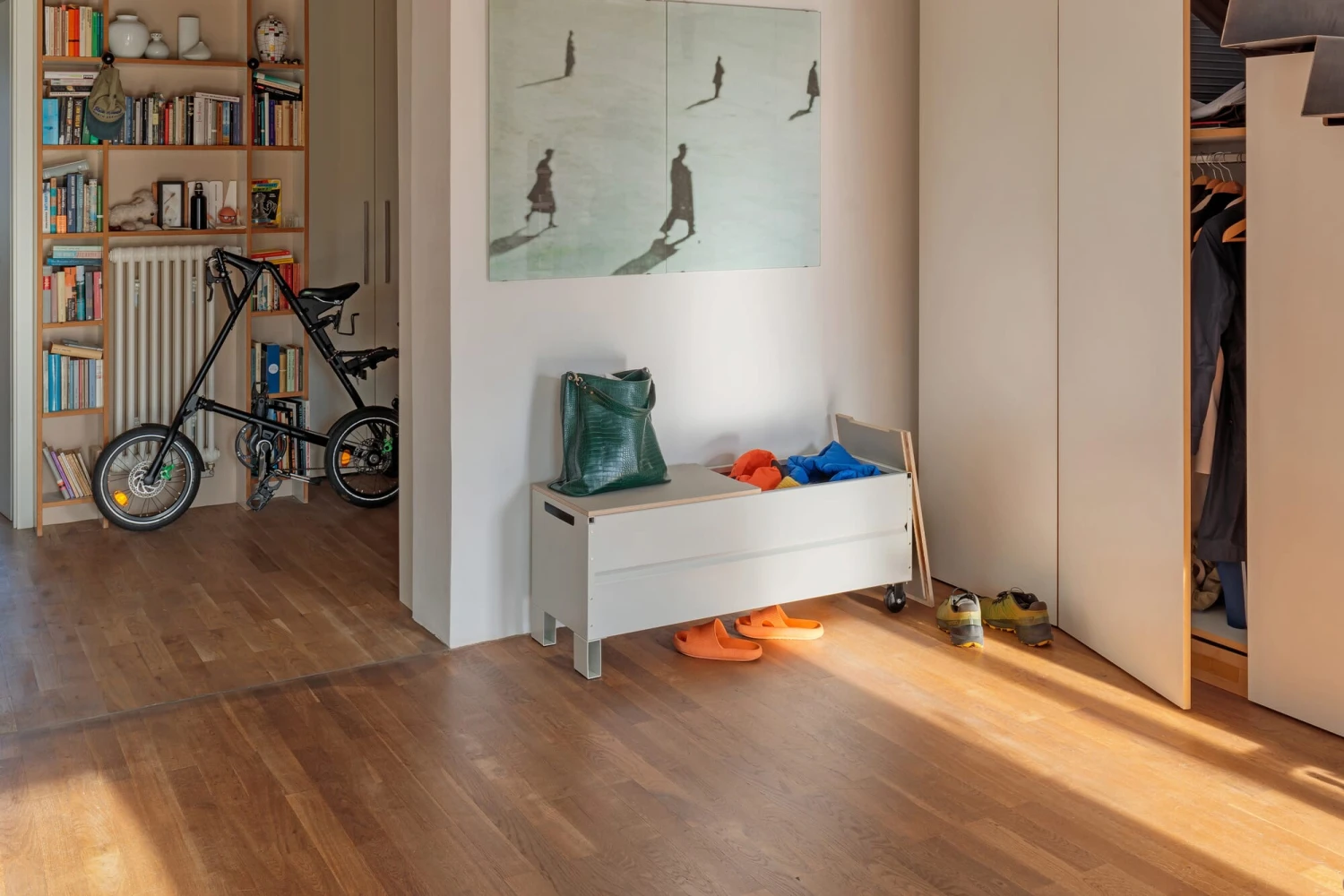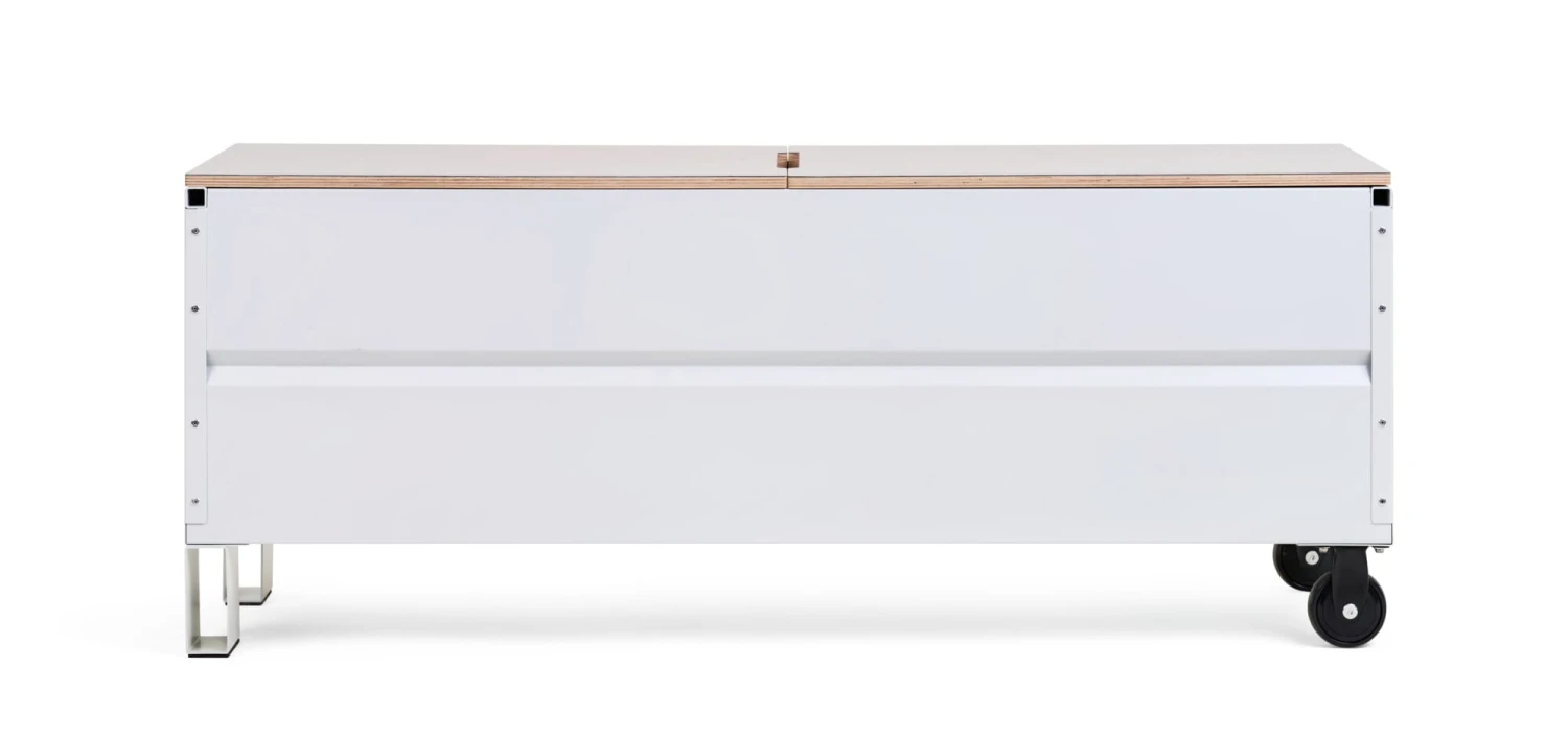 Als Truhe und Sitzbank zu nutzen – CMB ist die zeitgenössische Interpretation eines der ältesten Möbeltypen. Truhen unterschiedlicher Art dienen seit ewigen Zeiten als Aufbewahrungs- und Transportmittel. CMB ist ein würdiger Vertreter dieser Produktgattung. Sie erfüllt vielfältige Aufgaben in Haushalt, Büro und Wohnbereich. So ist sie im Schlafzimmer Stauraum für Bettwäsche, Wolldecke und Winterbekleidung im Sommer. Sie dient im Flur als Platz für den Zeitungsstapel, oder für die Unterbringung von Regenkleidung und Fahrradhelm, aber auch Getränkekisten finden Platz (aufgrund der unterschiedlichen Formate von Getränkekisten sind hierbei die Innenmaße von CMB zu berücksichtigen). Dank des entsprechenden Höhenmaßes erfüllt sie auch ihre Rolle als Sitzplatz für zwei Personen – oder für drei Kleine – am Küchentisch oder in der Diele. Der Transport von CMB fällt leicht, denn die an einer Stirnseite angebrachten Bockrollen und die Eingriffe an den Seiten ermöglichen leichtes Manövrieren auch im beladenen Zustand. Der Inhalt ist über die beiden mit Linoleum belegten und komplett abnehmbaren Holzdeckel leicht zugänglich. Wir mögen den industriellen Charme dieses dienstbaren Möbels.