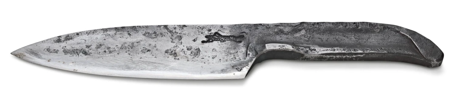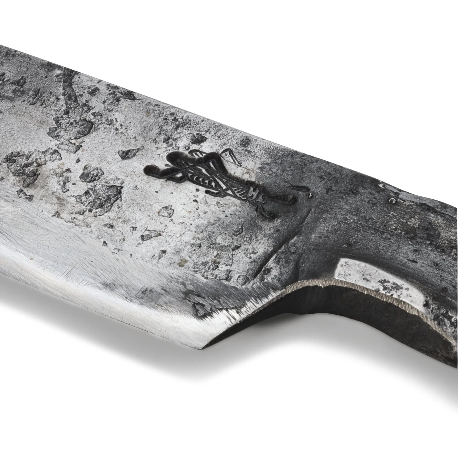 Die Gestalt dieses Messers entstammt einer Zeit, in der man anstelle einer Vielzahl von Spezialmessern, die aufgrund ihrer Form oder Materialität jeweils nur für einen bestimmten Zweck nutzbar waren, nur ein Messer für alles hatte. Auch in der Fertigung ist es auf das Wesentliche reduziert. Zunächst und ganz unmittelbar sieht man ihm an, dass es von Hand aus einem rohen Stück eines legierten, jedoch nicht rostfreien Stahls (einem 55Si7-Federbandstahl) geschmiedet ist. Der Schmied hat sich bewusst entschieden, die auf mindestens 55 HRC in Öl gehärtete Klinge nur zu schleifen und nicht zu pließten, wodurch die feinen Schleifriefen noch sichtbar sind. Als Zeichen seiner Herkunft trägt es eine mit einem Stempel eingeschlagene Heuschrecke, das Zeichen der bei Lüneburg ansässigen Schwarzen Schmiede.