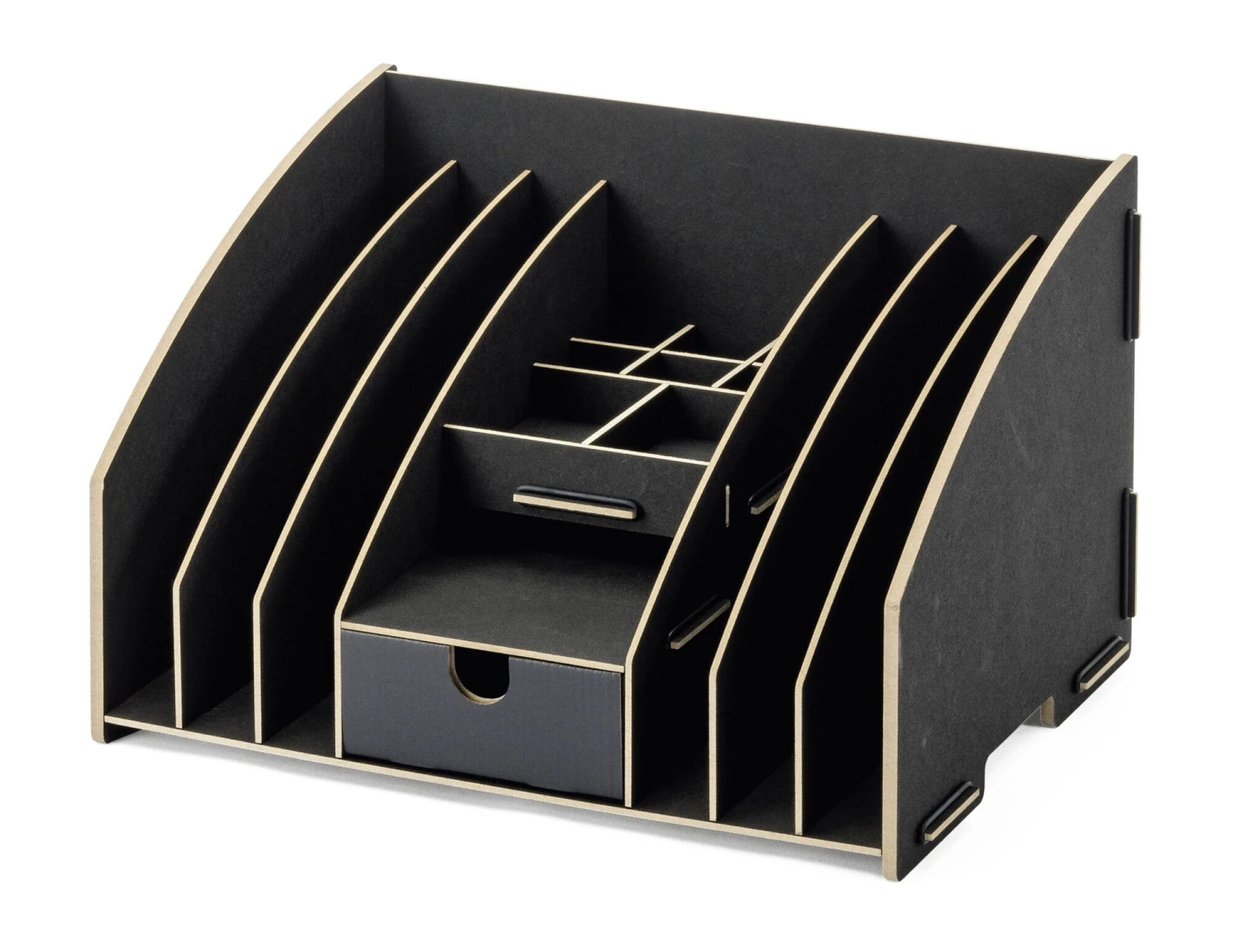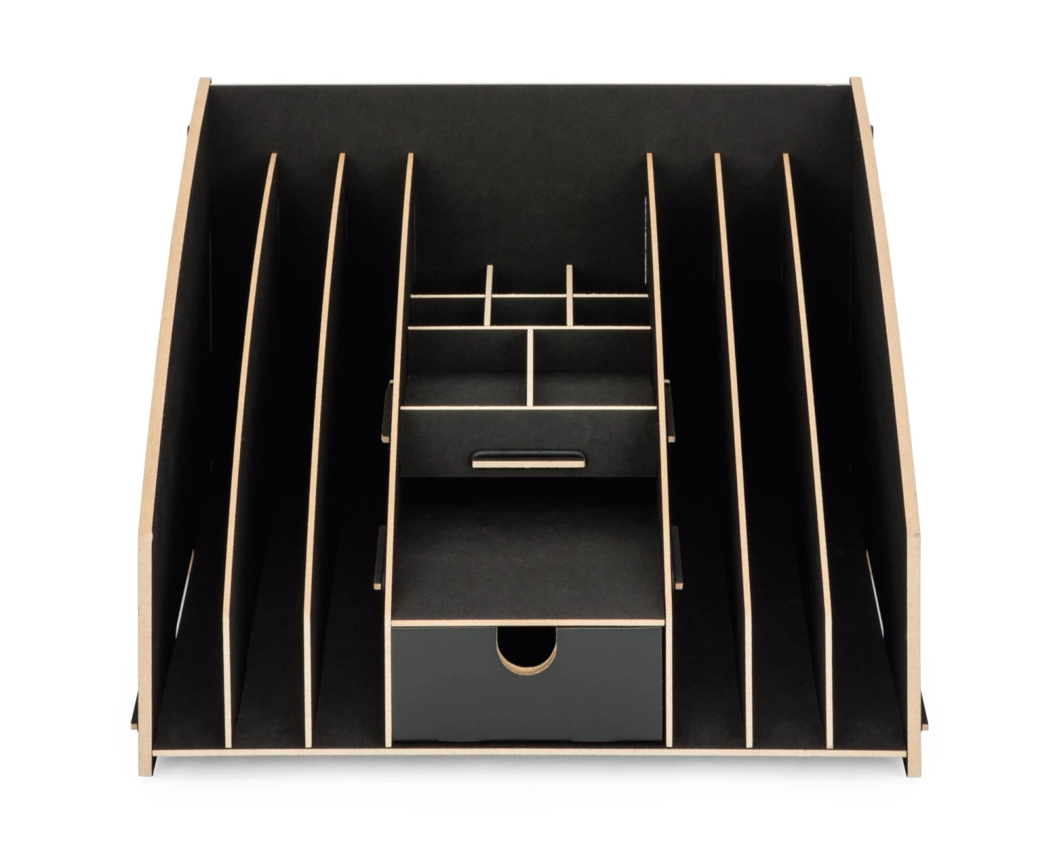 Einzeln wie auch kombiniert nutzbar sollten sie sein, die Schreibtischmöbel, die Werkhaus eigens für Manufactum entwickelt hat. Herausgekommen sind drei schwarze HDF-Leichtmöbel, die dem Bedarf und Platz ihres Nutzers entsprechend einsetzbar sind: Zwei von ihnen – die jeweils dreietagige Dokumentenablage und Schubladenbox – lassen sich (egal wie herum oder wie viele von ihnen) übereinander stapeln. Zu guter Letzt kann als oberer Abschluss der Organisator aufgesetzt werden; zur vertikalen Sortierung von Dokumenten und Briefen sowie zur horizontalen Aufbewahrung von Kleinteilen.
