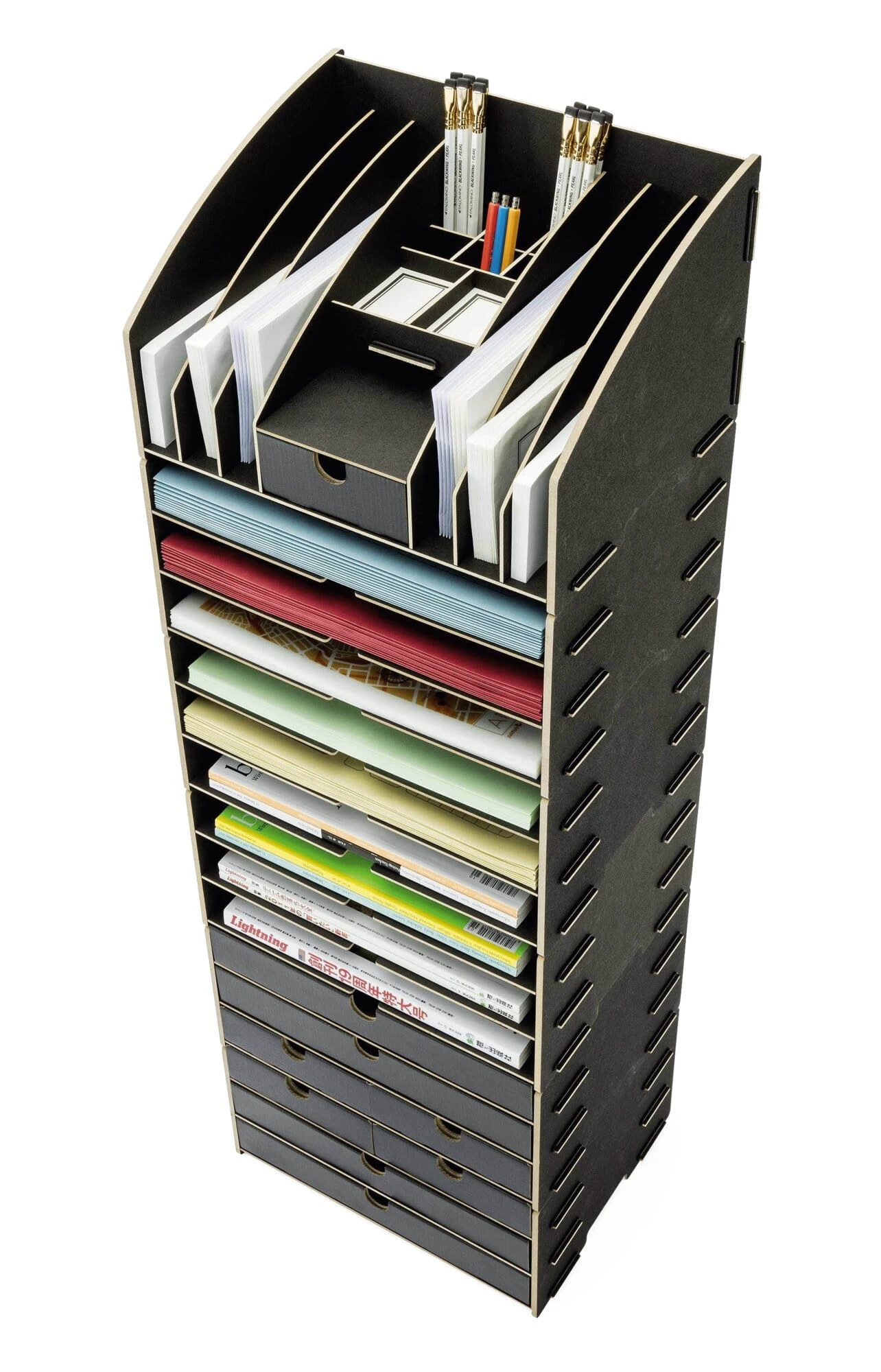Bei der Planung zu beachten: Wird der Organisator auf die Schubladenbox gestellt, passt konstruktionsbedingt die obere Schublade nicht mehr an ihren vorgesehenen Platz. Wir empfehlen deshalb, das obere Fach als offene Ablage zu nutzen.