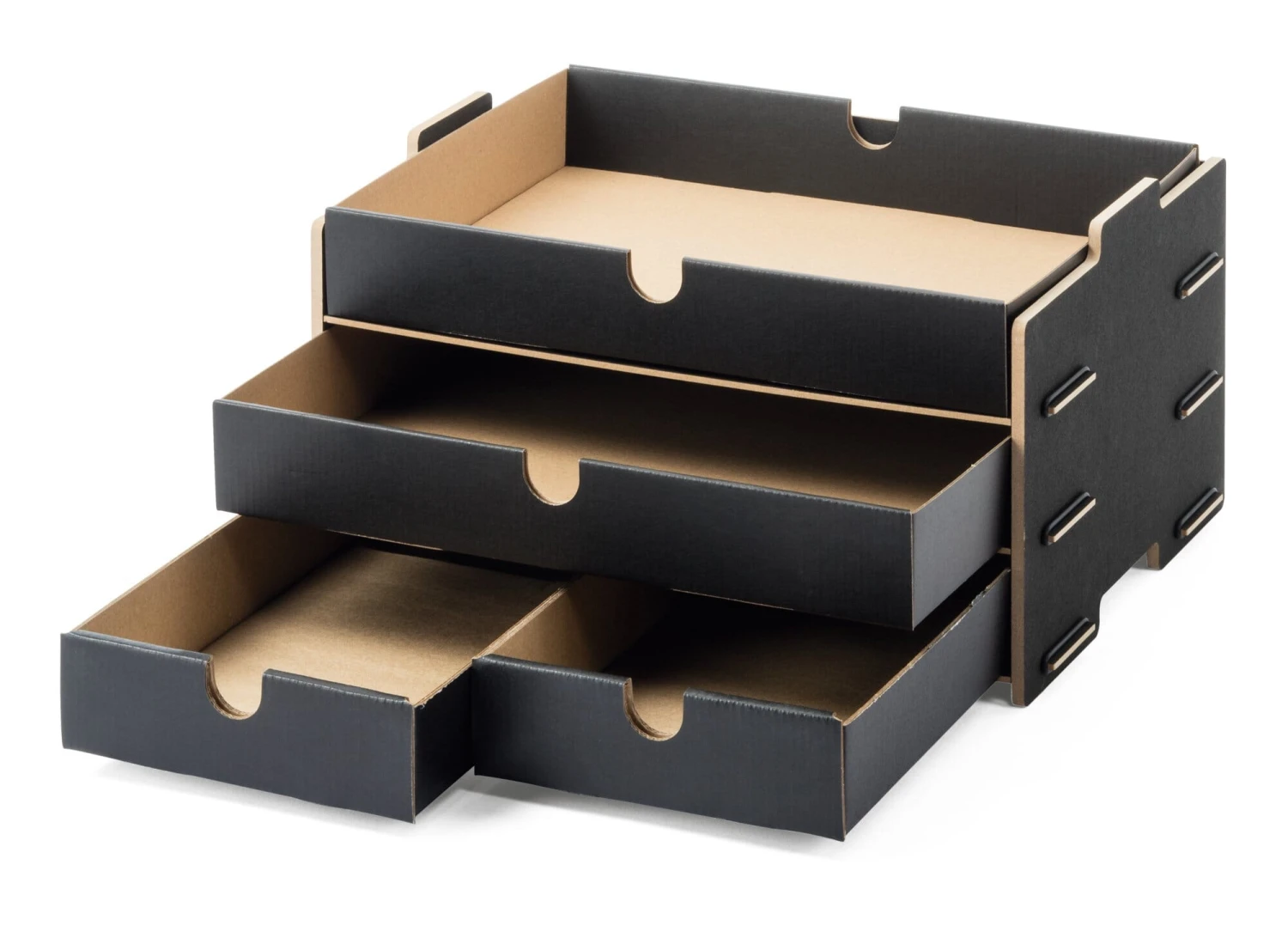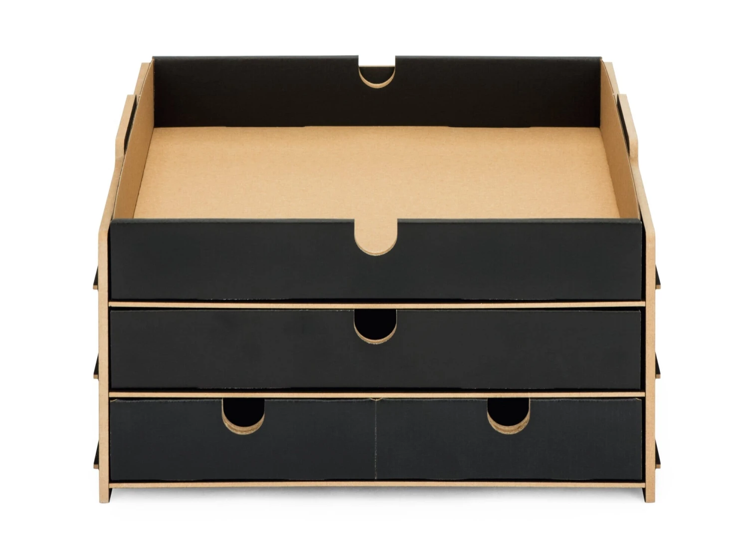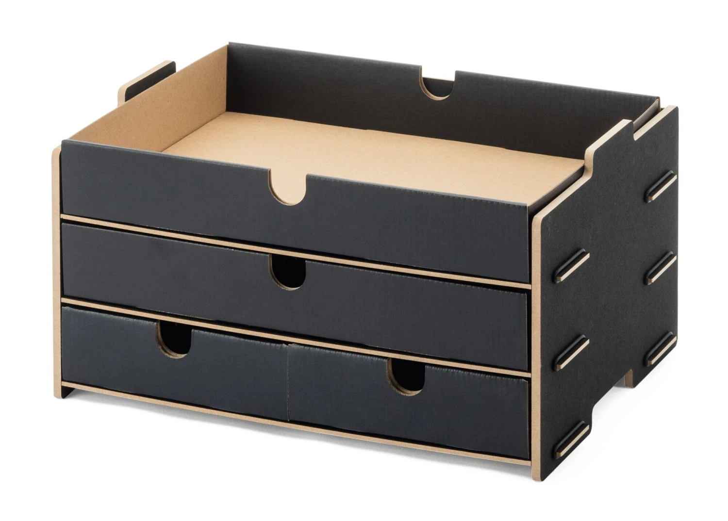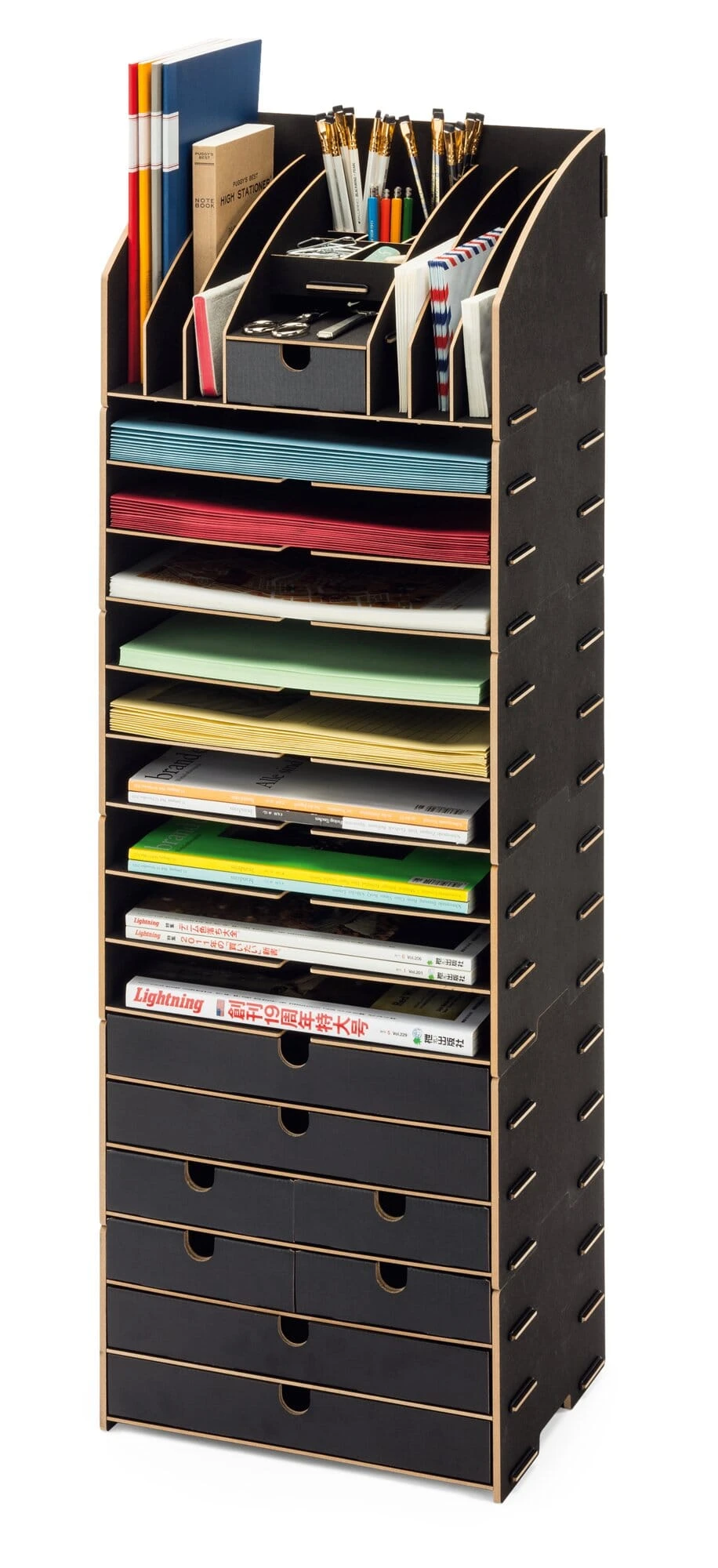 Diese Ordnungsmöbel für Schreibtisch und Büro gehören zu den ersten Produkten von Werkhaus und bewähren sich bereits seit mehr als 20 Jahren mit ihren vielen Fächern unterschiedlicher Größe und Anordnung. Eigens für uns hat der Hersteller sie auch in Schwarz produziert.