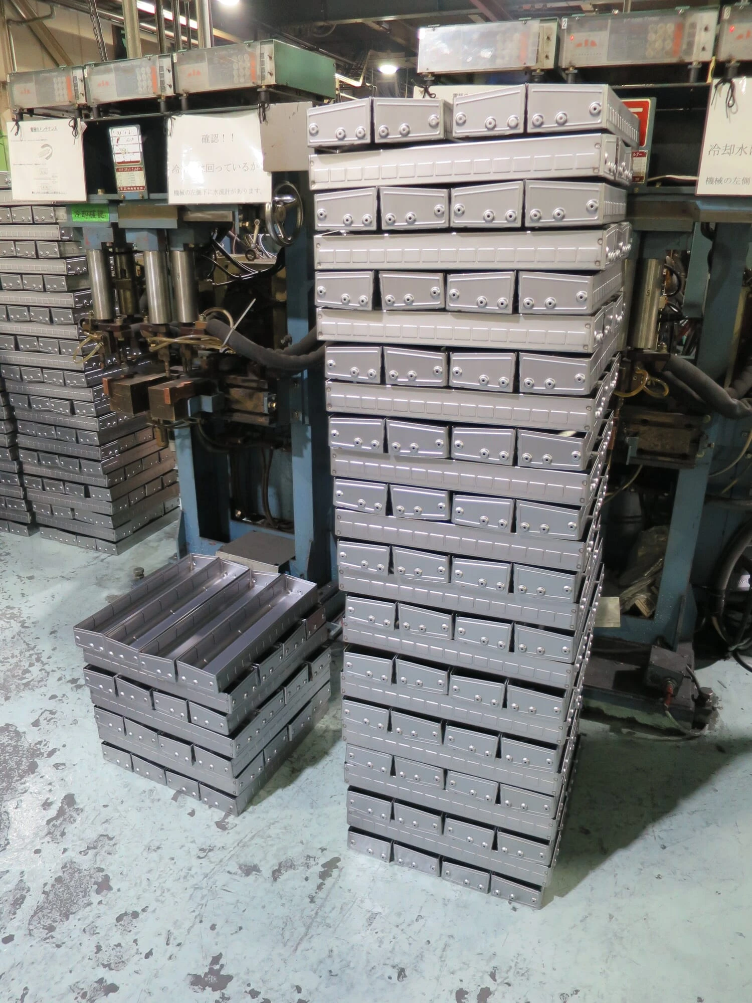 Den Kontakt zur Firma TOYO STEEL fanden wir über Umwege, als wir auf einem Flohmarkt vor Jahren eine Werkzeugkiste von ausgezeichneter Qualität fanden. Der Rechercheweg führte uns nach Japan zu TOYO STEEL. Seit 1969 produziert der Werkstatt-Ausstatter aus Osaka Behälter aus Stahlblech. Wie bei vielen japanischen Produkten prägt ein hoher Anspruch an Perfektion in Ausführung, Material und Proportion die Erzeugnisse aus diesem Haus. Es ist interessant zu sehen, wie sich japanische manufakturelle Produktkultur auch in solch industriell produzierten Erzeugnissen wiederfindet. Wie beispielsweise bei der Universalkiste TOYO: fein abgerundete Ecken und Kanten, Ober- und Unterteil aus je einem Stück Stahlblech tiefgezogen, das verbindende Scharnier aus dem Deckel herausgearbeitet. Somit ist die Universalkiste eine schweißnahtlose, leichte und dennoch robuste Utensilienbox von beeindruckender Verarbeitungsqualität. Eigenschaften, die wir bei all den Produkten von TOYO STEEL vorfinden.