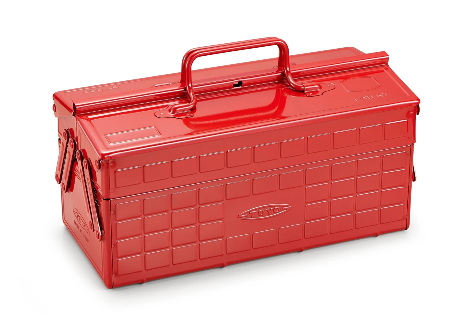 Die perfekte Werkzeugkiste – aus Japan von Toyo Steel: praktisches, schmales Format, schweißnahtloser Aufbau der Grundstruktur, hohe Wandstärke des Stahlblechs. Die geprägte Waffelstruktur an Innen- wie Außenseite verleiht dem Stahlblech zusätzliche Stabilität und Robustheit. Vier lose einsetzbare Metalleinteilungen unterteilen die obersten beiden Fächer. Im geöffneten Zustand wird das unterste Fach komplett freigegeben, die Werkzeuge sind so bestens greifbar. Wegklappbare Griffe, zwei Deckelösen ermöglichen das Abschließen des Werkzeugkastens. Für vielerlei Kleinkram – nicht nur für Werkzeug.