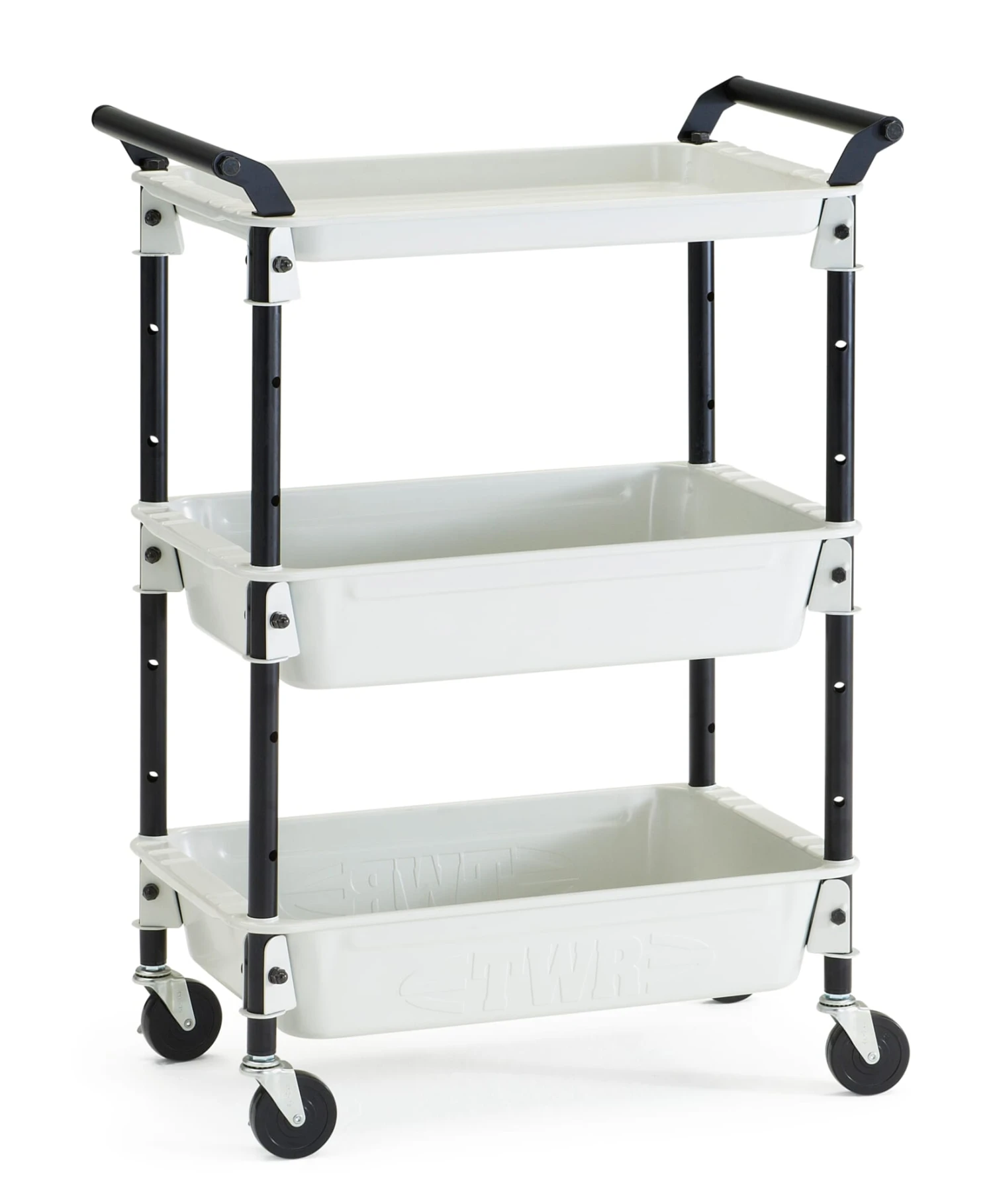 Dieser robuste Rollwagen aus einer kompletten Konstruktion aus Stahl wurde für die Werkstatt gemacht und trägt zuverlässig bis zu 80 kg. Seine Machart, der überzeugende Materialeinsatz sowie die ablesbare Qualität unterscheiden ihn von vordergründig vergleichbaren Produkten am Markt. Er eignet sich für die vielfältige Nutzung in Küche, Wohnraum, Bad oder Büro. Die drei tiefgezogenen Stahlblechwannen sind robust und in zwei unterschiedlichen Bauhöhen verfügbar. An den senkrechten Rundholmen können sie in der Reihenfolge frei positioniert und in der Einsatzhöhe verstellt werden. Vier drehbare Gummirollen – davon zwei mit je einer Bremse ausgestattet – sorgen für gute Manövrierfähigkeit. Der Wagen kommt als Bausatz und ist leicht zu montieren.