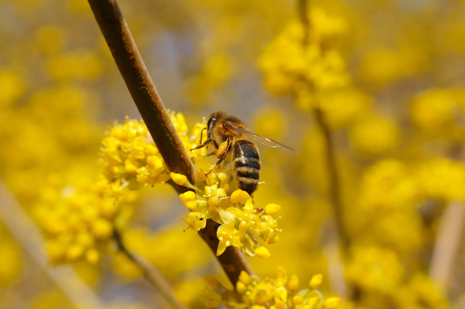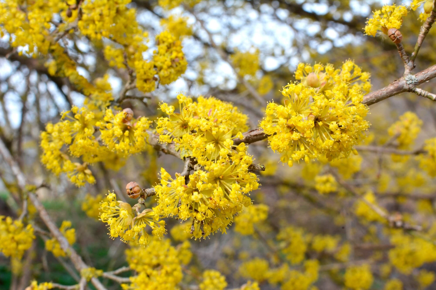 Baumartiger Strauch, bis 6 m hoch, sehr langsamwüchsig und alt werdend. Leuchtendgelbe, kugelige Blüte, oft schon ab Februar. Die Kornelkirsche ist damit eines der frühestblühenden Holzgewächse Mitteleuropas. Gelbrote Herbstfärbung des Laubes. Nicht selbstfruchtbar, ein passender Partner ist die Wildform Cornus mas.