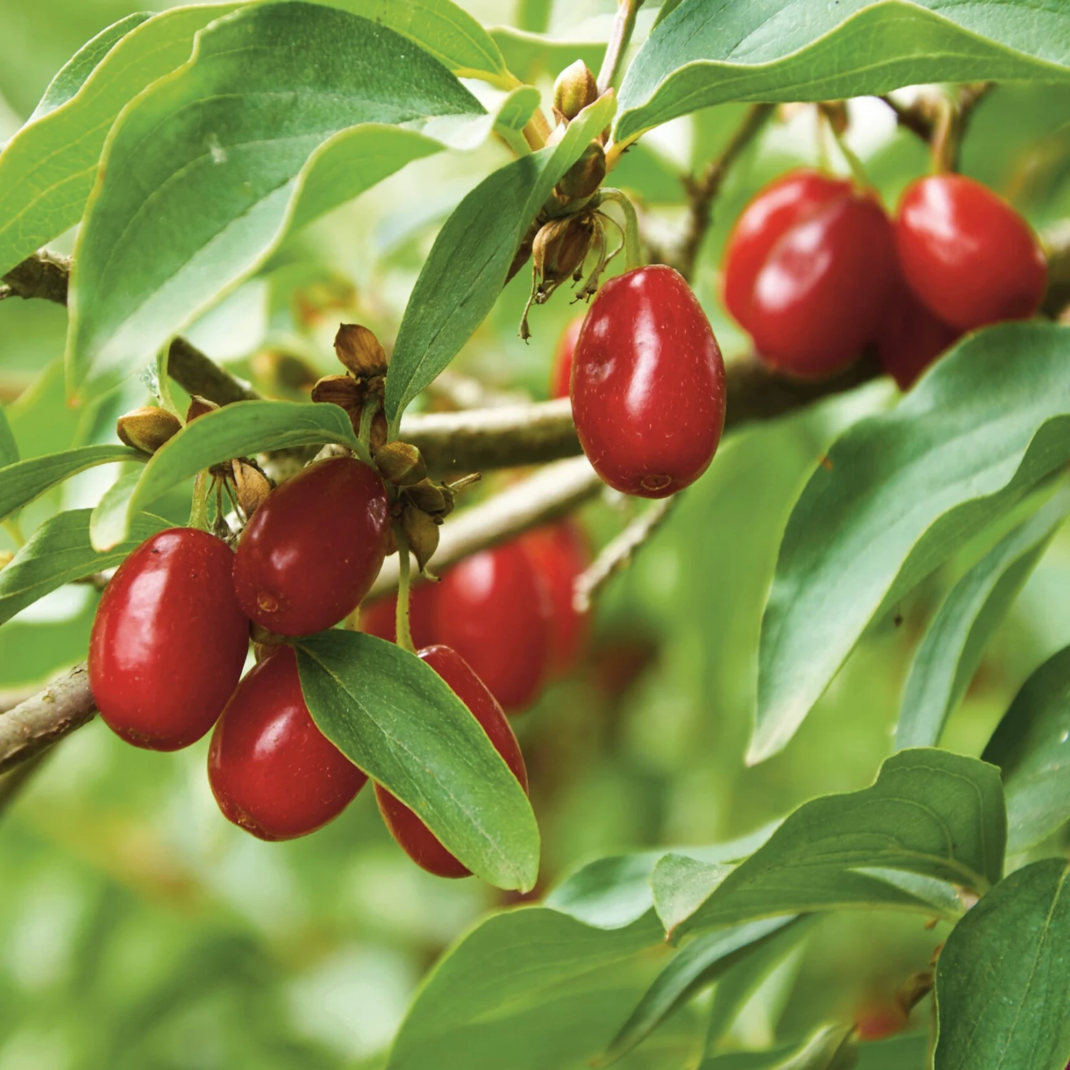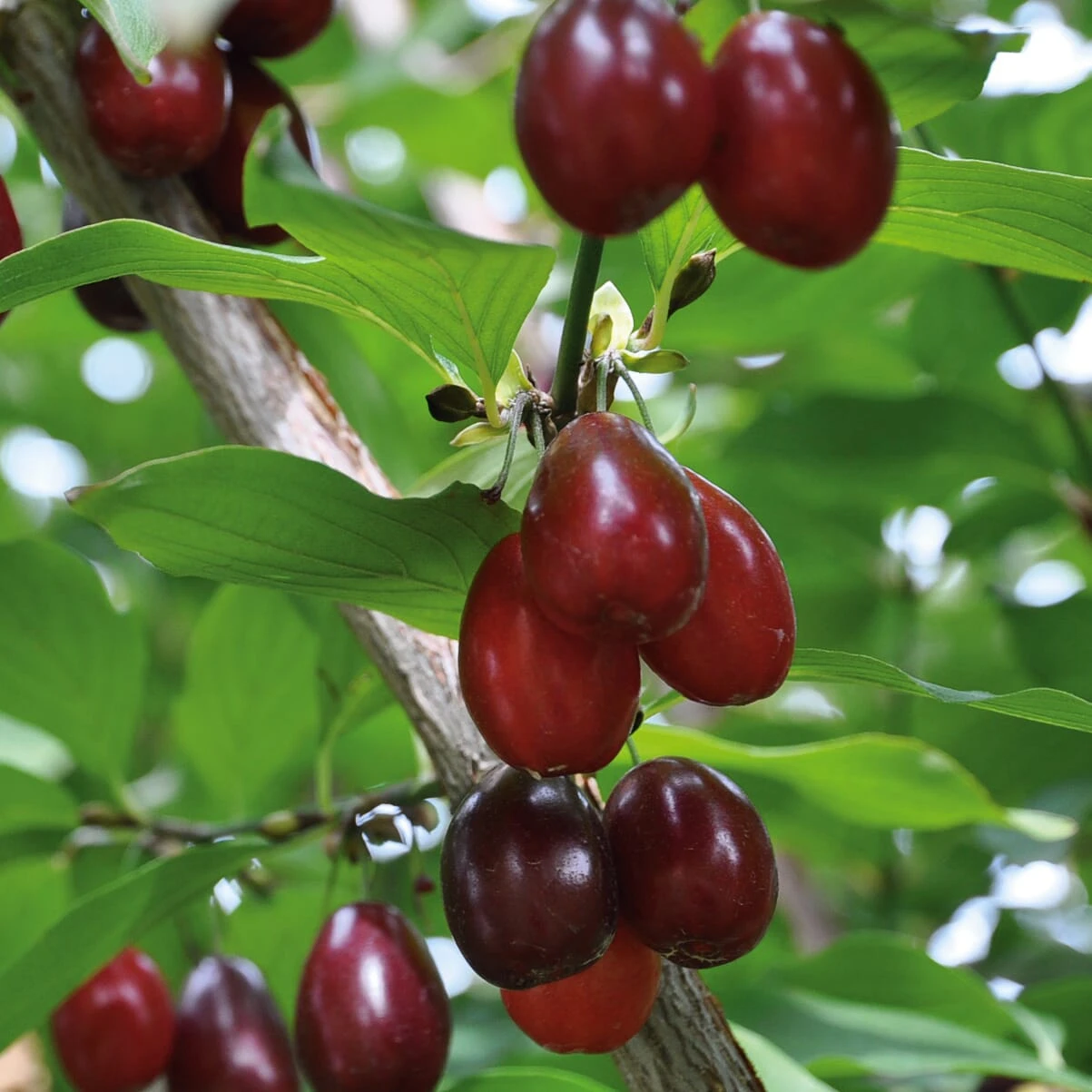 Bis 3 cm große, birnenförmige, leuchtendrote Steinfrüchte (Kornellen). Angenehm süß ohne störenden Nebengeschmack, leckere Naschfrucht. Reife ab Ende August. Nicht lagerfähig, aber zu einer hervorragenden Marmelade, Kompott, Saft oder Likör zu verarbeiten.