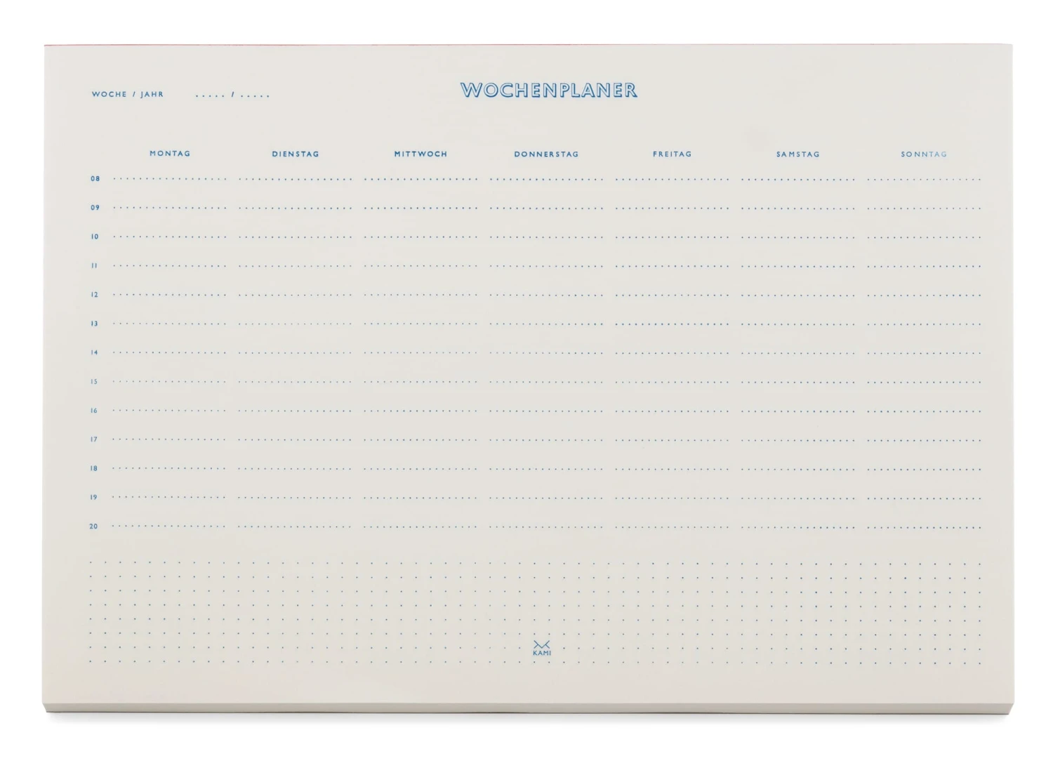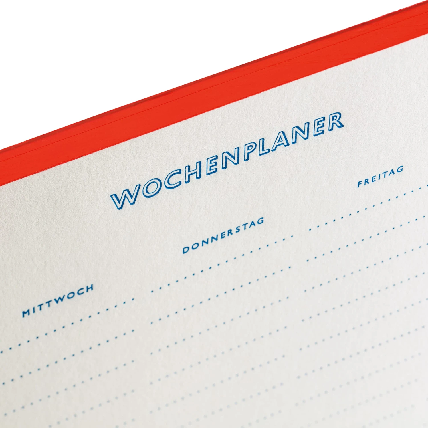 Mit blauer Tinte auf historischer Maschine gedruckt und neonrot gummiert geklebt: KAMI ist übersichtlicher Planer für die 52 Wochen des Jahres.
