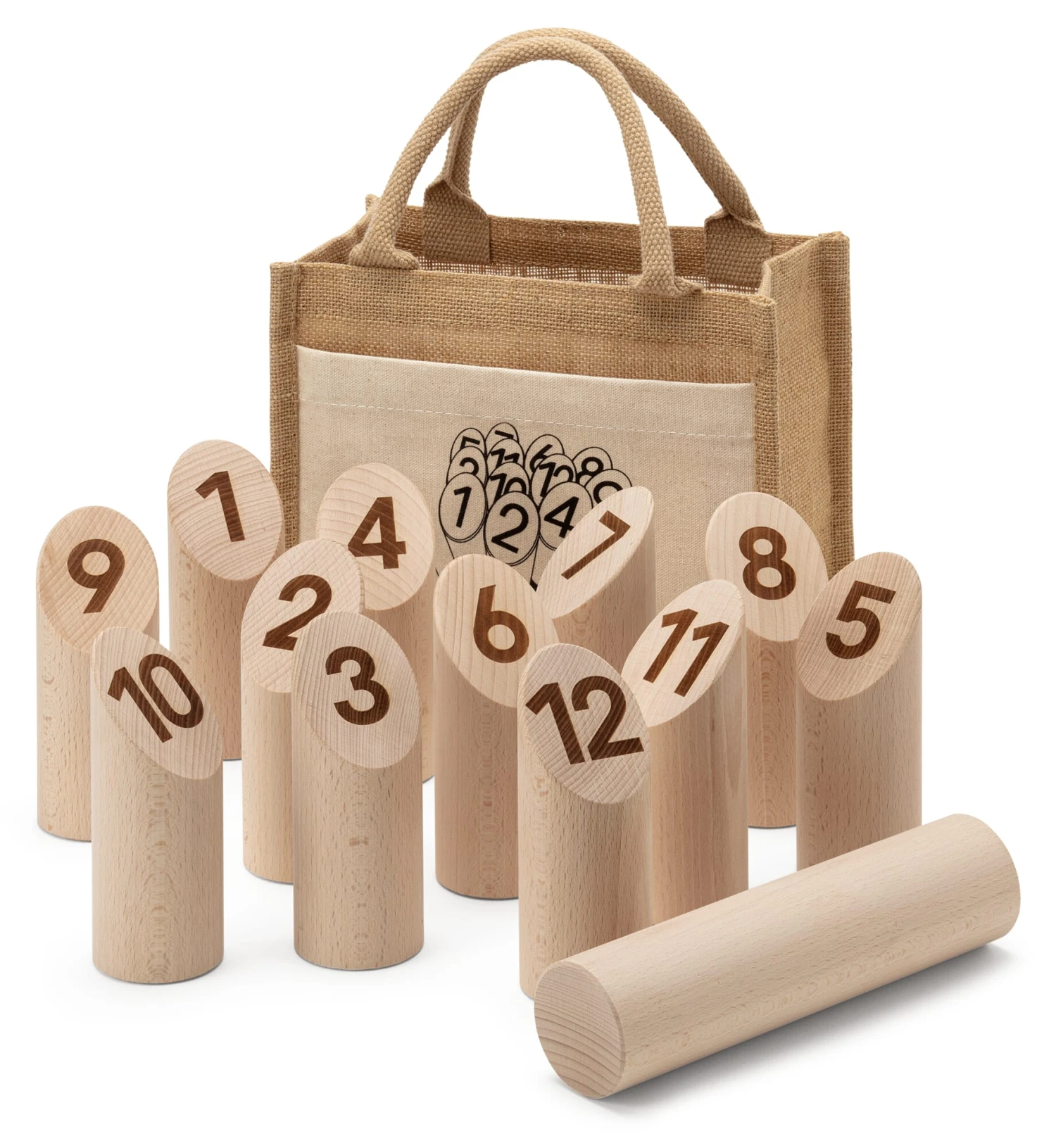 Werfen, Treffen, Punkte zählen – darum geht es beim Weikky. Am Anfang steht, wie so oft, die Ordnung. Zwölf nummerierte Holzkegel werden in festgelegter Gruppierung dicht an dicht aufgestellt. Mithilfe des Wurfholzes müssen die Holzkegel umgeworfen werden – vorgeschlagen sind drei bis vier Meter Entfernung, doch natürlich kann der Abstand gemäß Alter und Wurfkraft der Mitspielenden variiert werden. Um Punkte zu erzielen, genügt es nicht, die Kegel zu treffen, oh nein. Die getroffenen Kegel müssen auch möglichst schwungvoll umfallen – denn nach dem Punktezählen werden sie an just der Stelle wieder aufgestellt, auf die ihre Spitze zeigt, nachdem sie gefallen, möglicherweise auch geflogen sind. Der Abstand der Kegel zueinander und die Spielfläche vergrößern sich also mit jedem Wurf und Treffer – und damit auch der Schwierigkeitsgrad, einen Kegel zu treffen. Fällt nur ein Kegel, wird die Punktzahl gezählt, die in den Holzkegel groß eingraviert und damit dauerhaft lesbar ist. Bei allem Siegeswillen werden Sie sich also nicht mit kaum zu entziffernden Zahlen aus Ihrer Trefferquote herausargumentieren können. Fallen dagegen mehrere Kegel, wird deren Anzahl addiert. Vielleicht möchten Sie sogar Ihre eigene Ergebnisformel entwerfen, doch welche Variante Sie auch wählen: Exakt 50 Punkte, nicht mehr, nicht weniger, muss in Summe erzielen, wer siegreich aus dem Spiel hervorgehen will. Sollten Sie mit Ihrem (vorerst) letzten Treffer über diesen Punktestand hinausschießen, werden Sie auf 25 Punkte zurückgesetzt und dürfen sich erneut an die 50er-Marke heranpirschen … ach nein, heranwerfen. Ein gutes Auge, ein koordiniert kraftvoller Wurfarm und eine geschickte (Zahlen-)Strategie sind also erforderlich, um als Sieger*in Einlass in die Ruhmeshalle des Weikky zu finden. Möge das Wurfspiel beginnen!