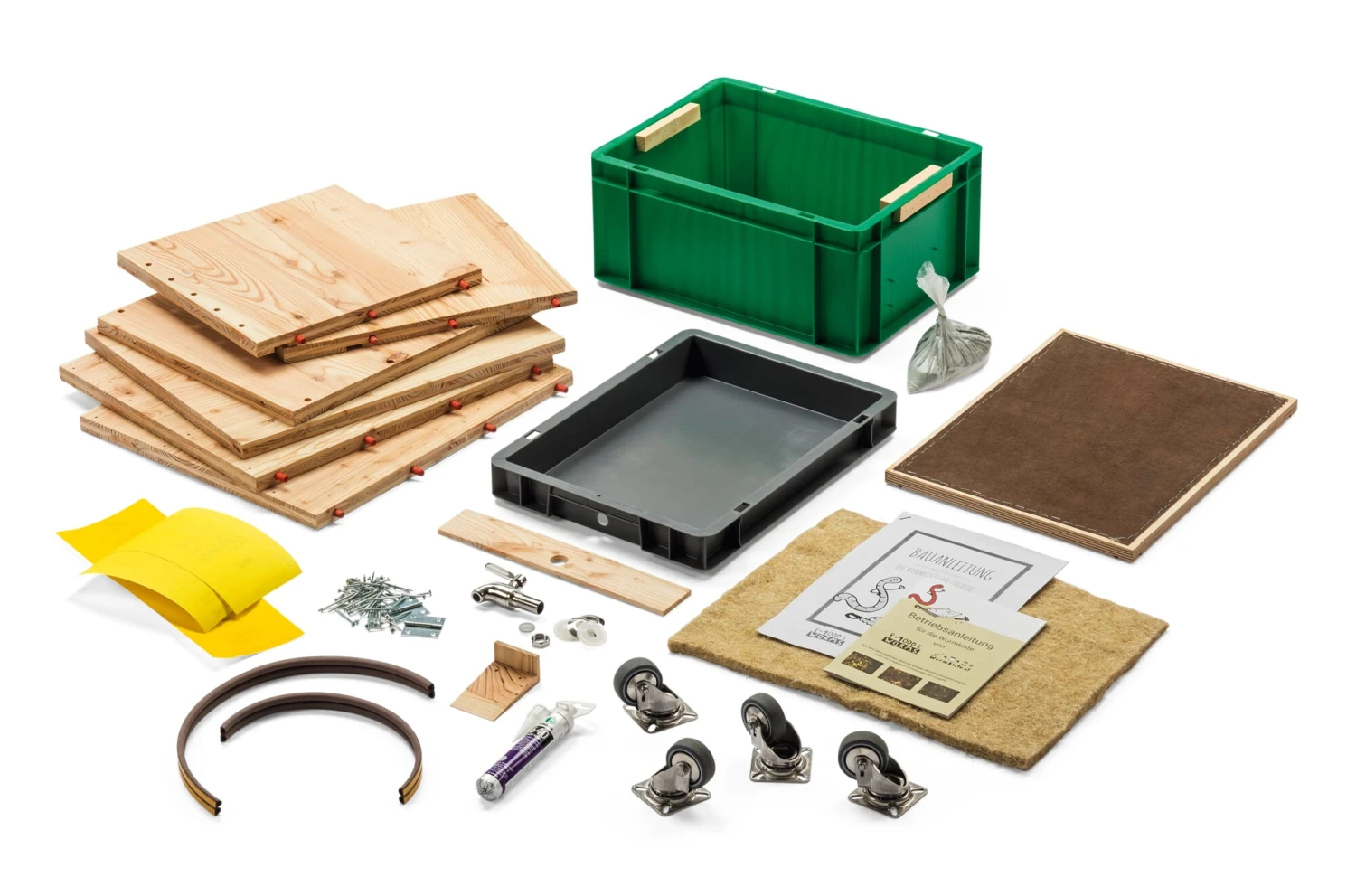 Diesem Set liegen sämtliche Teile bei, die zum Zusammenbau der Wurmkiste benötigt werden, bis hin zur Gummiabdichtung für den Deckel der Kiste, einem Fläschchen Kleber und dem benötigten Befestigungsmaterial. Ein Beutel Kalk-Gesteinsmehl liegt ebenfalls bei, das die Würmer mit mineralischen Nährstoffen versorgt und von dem sie regelmäßig eine Gabe erhalten sollten. (Die Würmer müssen Sie separat bestellen.)