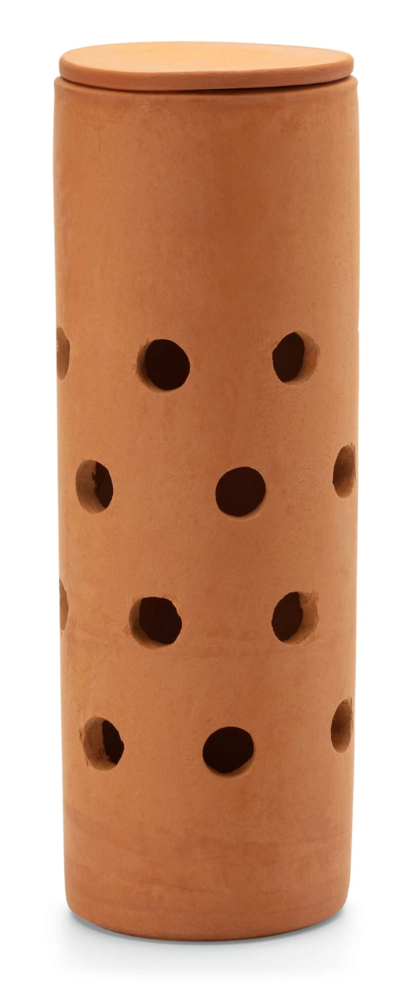 Unsere Gartennachbar*innen in Frankreich praktizieren eine ebenso einfache wie wirkungsvolle Kompostierungsmethode, die Beet-, Hochbeet- und Kübelpflanzen nachhaltig auf die Sprünge hilft. Dafür wird eine mit zahlreichen runden Löchern versehene Terrakottaröhre so tief in die Erde eingegraben, dass die Öffnung samt Deckel nur noch knapp herausschaut, und fortlaufend mit leicht zersetzbaren, zerkleinerten organischen Küchenabfällen befüllt. Das Prinzip ist von den sogenannten Schlüssellochbeeten der Permakultur bekannt: Kompostwürmer finden ihren Weg durch die Löcher ins Innere der Röhre – ihre Speisekammer – und wandeln die gesammelten Abfälle in Wurmkompost um. Dieser Wurmkompost steht den Pflanzen direkt an Ort und Stelle als wertvoller Dünger zur Verfügung (die Löcher in der Tonröhrenwand sind schließlich keine Einbahnstraße). Es wird empfohlen, den Kompost gelegentlich mit einer kleinen Schaufel oder Gabel aufzulockern. Wenn Sie weitere Hochbeete oder Pflanzkübel mit Wurmkompost versorgen und die Tonröhre daher ab und an entleeren möchten, achten Sie darauf, nur Kompost, aber keine Kompostwürmer zu entnehmen. Unser Wurmkomposter passt für Hochbeete sowie große Pflanzgefäße und kann seine guten Dienste ebenso gut im offenen Gartenbeet leisten. Wir beziehen ihn aus einer Töpferei im französischen Baskenland.