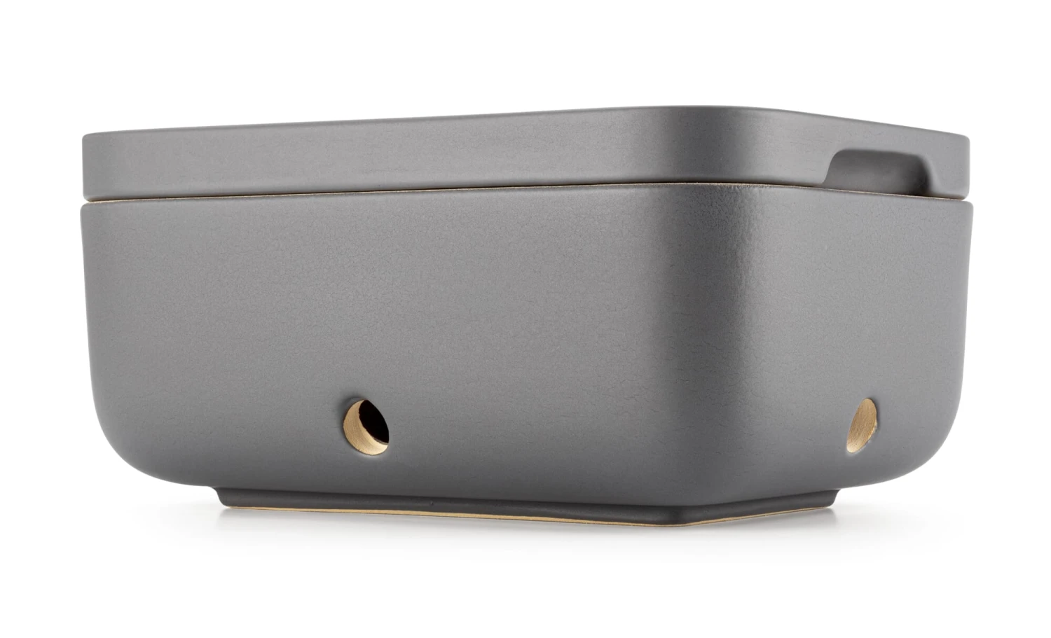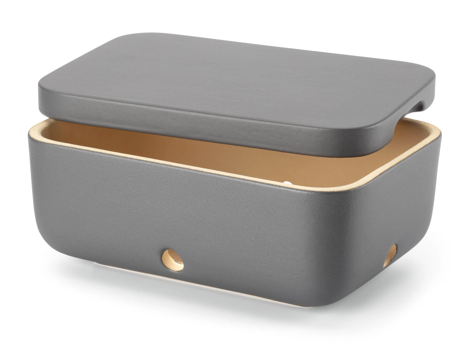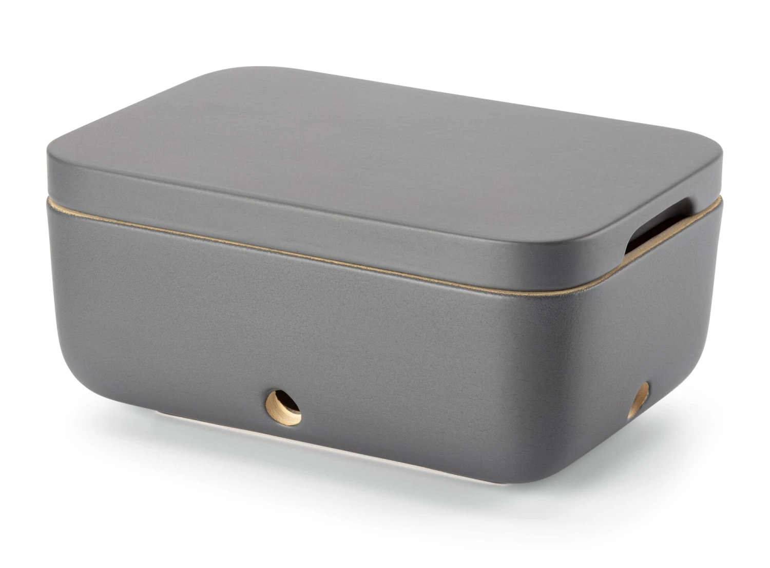 Kleiner formschöner Vorratskasten aus Keramik, einem idealen Material für ein Vorratsgefäß, wenn es so gearbeitet ist wie dieses: Die unglasierten rauen Innenflächen des Behälters speichern bis zu 10 Prozent der Luftfeuchtigkeit. Das sorgt im Zusammenspiel mit der Luftzufuhr durch Löcher an vier Seiten für ein verbessertes Klima für das Lagergut. Ideal geeignet für Zwiebeln – etwa 1 kg passt in den Behälter – oder anderes kleinformatiges Gemüse. Stapelbar.